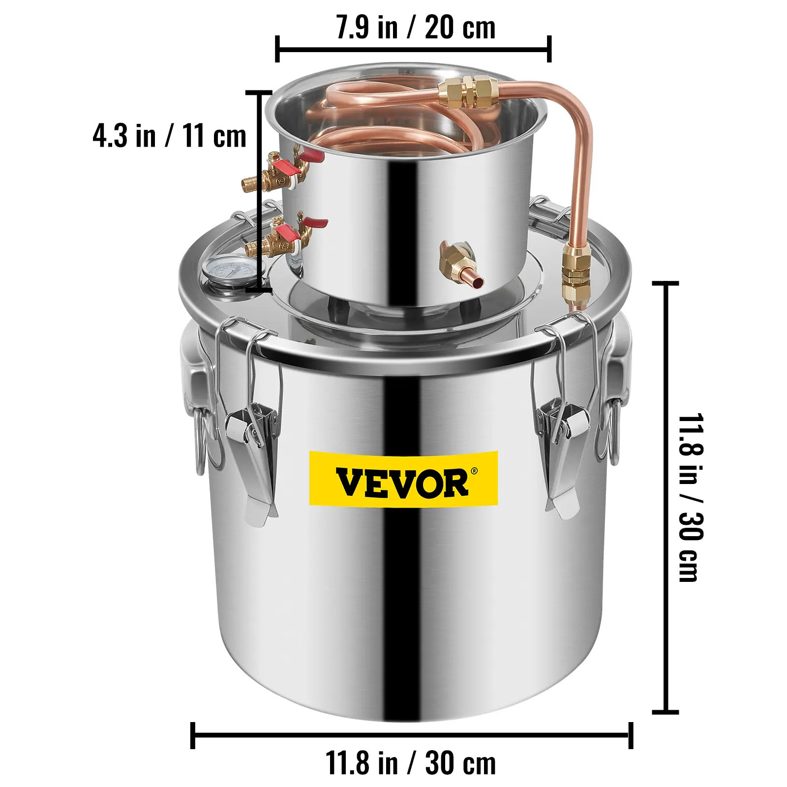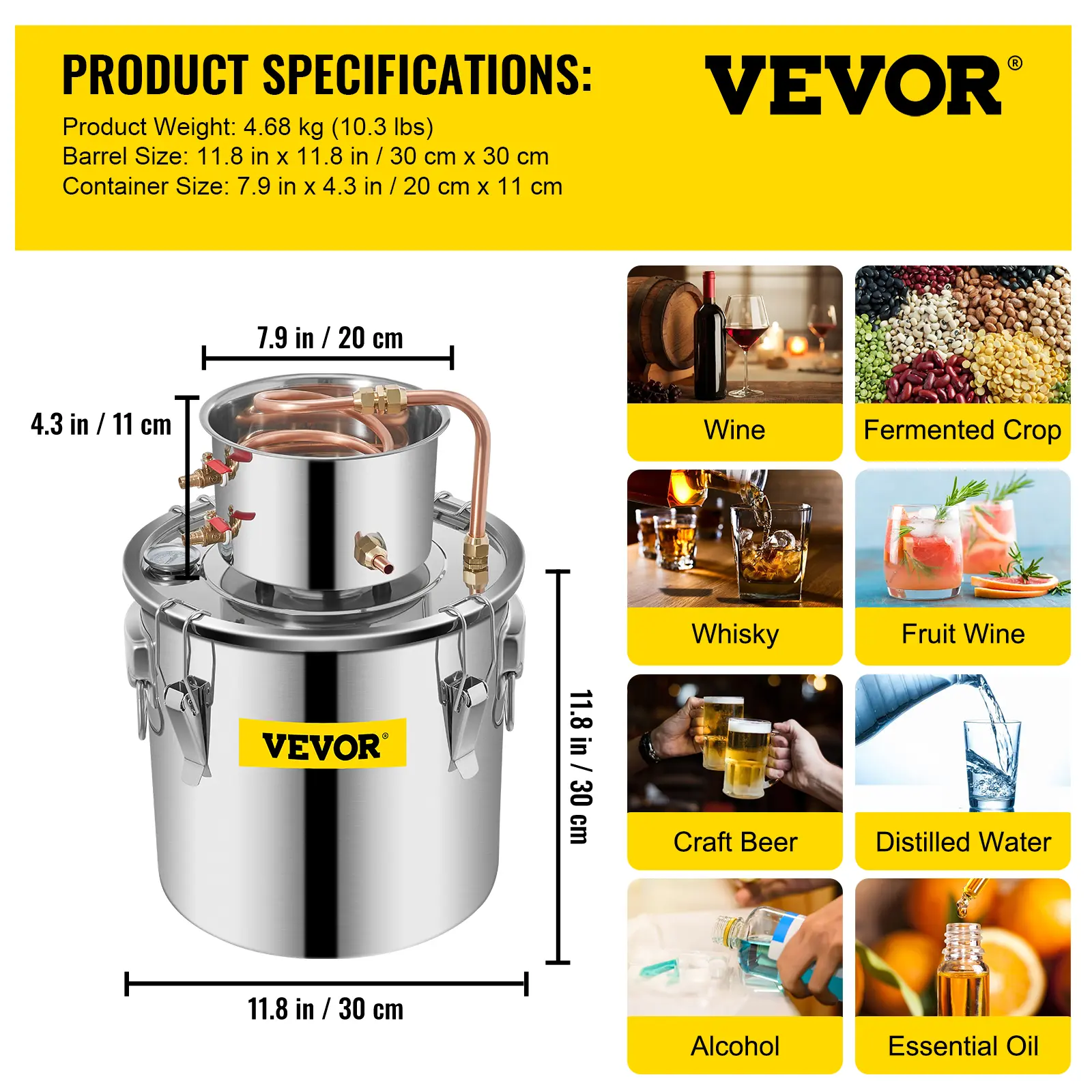 • Sufficient Capacity: This alcohol still provides you with a fermentation capacity of 5 gallons. Boiler barrel: 11. 8" x 11. 8" (30 x 30 cm), condenser: 7.9" x 4.3" (20 x 11 cm), which can ferment up to 19 liters of raw materials. Perfect for family-together parties. All parts are made of food-grade materials, including silicone, stainless steel, and copper.