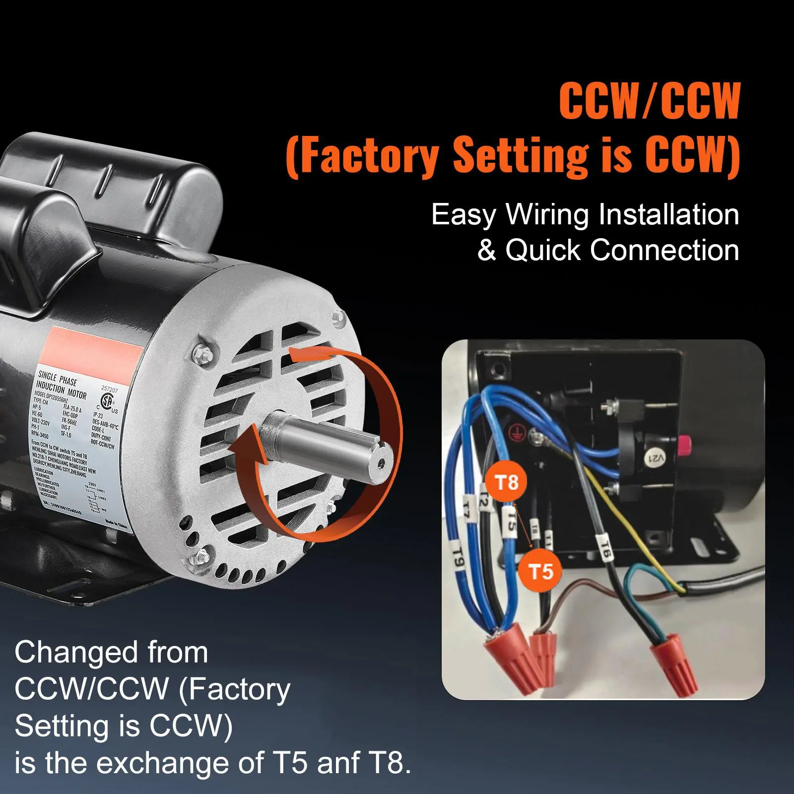 • High Performance: 5HP 3450 RPM, Single Phase, Full Load Amps: 25Amp, 230V 60Hz, SF: 1.0.