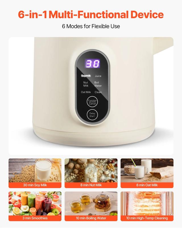 This versatile nut milk maker integrates 6 functions: soy milk, nut milk, oat milk, fruit & veggie drinks, boiling water, and high-temp cleaning. One-touch start or switch, plus a 12-hour preset, lets you set it at night for fresh drinks. Avoid multiple operations with its large 20 oz capacity.