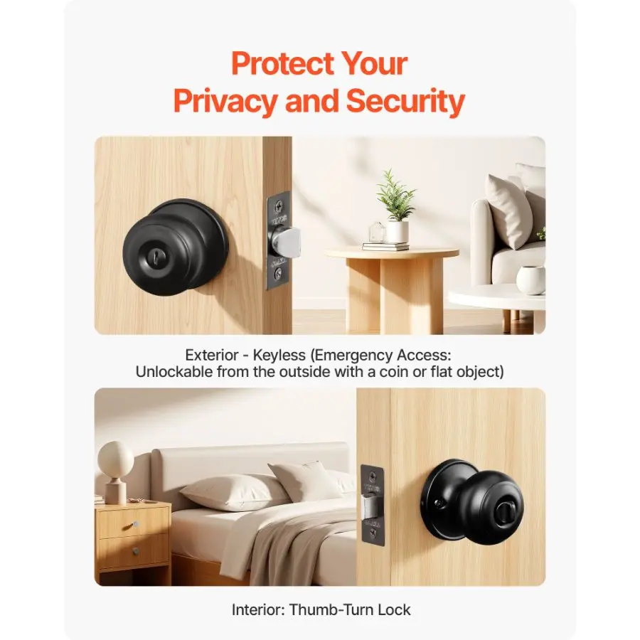 VEVOR 6 Pack Black Door Knobs, Privacy Door Knob with Round Ball, Keyless Exterior Thumb Turn Lock Interior, All Metal Doorknobs Hardware, Matte Black Modern Design for Bedroom BathroomVEVOR Super Brand Day
