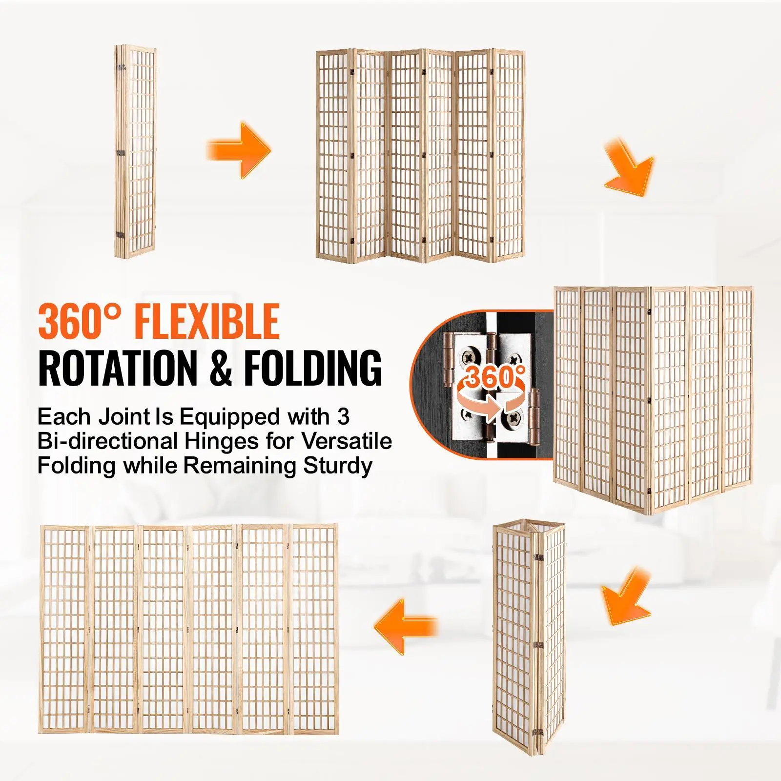 • 360° Rotating and Folding: Each room divider panel connects with three flexible bidirectional hinges, allowing you to rotate it 360° and fold it in any direction. This design ensures stability while you use it. When you're not using this room divider, simply fold it up and tuck it away in a corner - no clutter, just convenience. Set it up in a zigzag for added support and to avoid tipping.