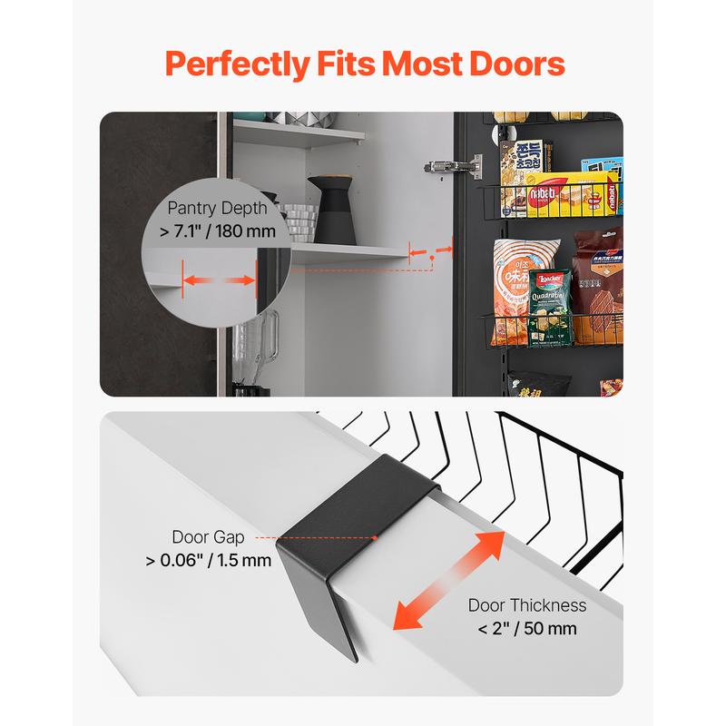 • Fits Most Doors: This over the door pantry organizer is compatible with doors that have a panel thickness of no more than 2 in / 50 mm, and the door gap must be greater than 0.06 in / 1.5mm. There should also be at least 7.1 in / 180mm of clearance between the door and the pantry shelf. Please check your cabinet door dimensions to ensure a proper fit and smooth door closure