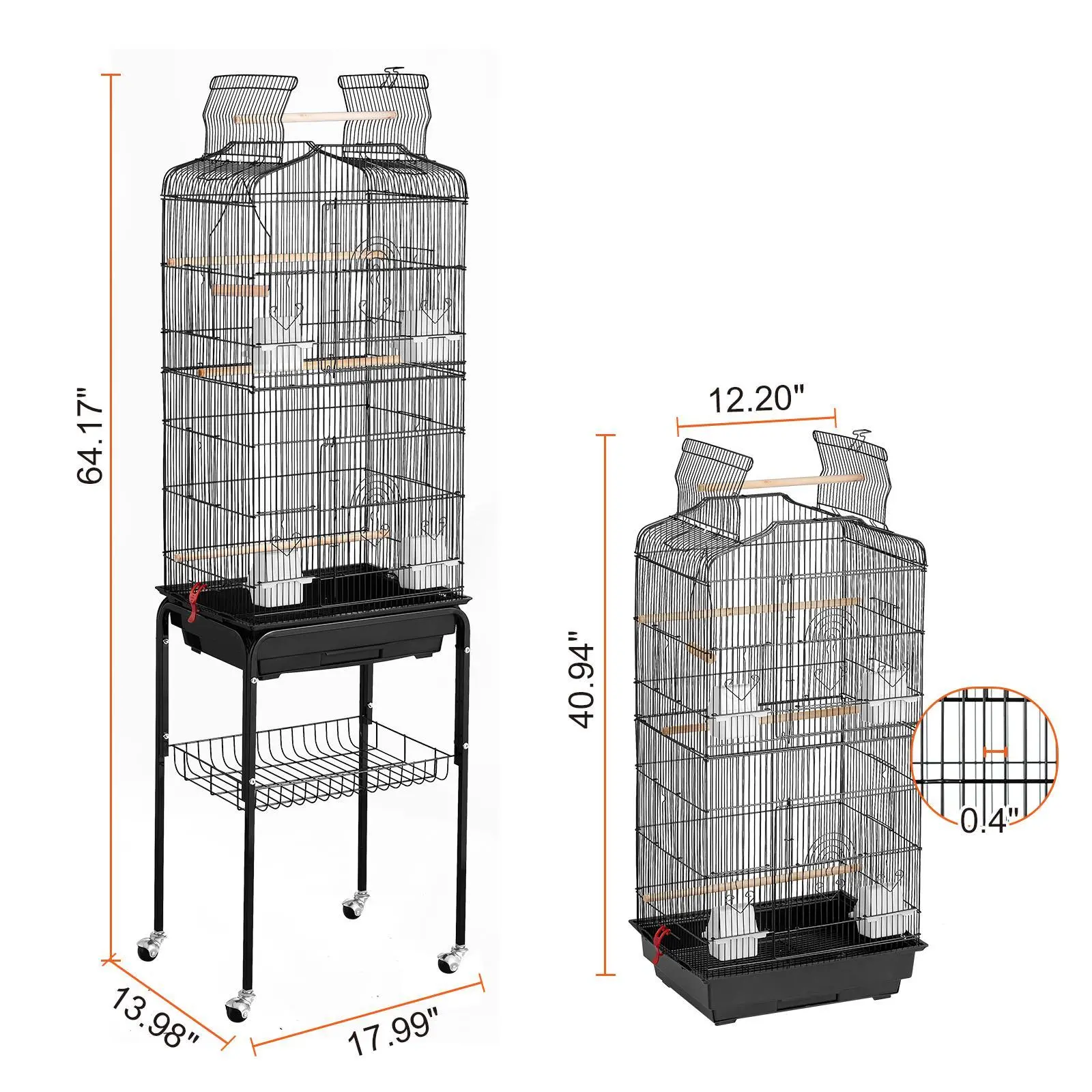 • Spacious Design: With dimensions of 17.99x13.98x59.45 in/457x355x1510 mm, the parakeet cage features a total height at 64.17 in/1630mm when the top is opened, while the bar spacing is 0.4 inches. This spacious bird cage it can accommodate 2-3 birds, such as lovebirds, long-tailed parakeets, parrots, rainbow lorikeets, and lovebirds.