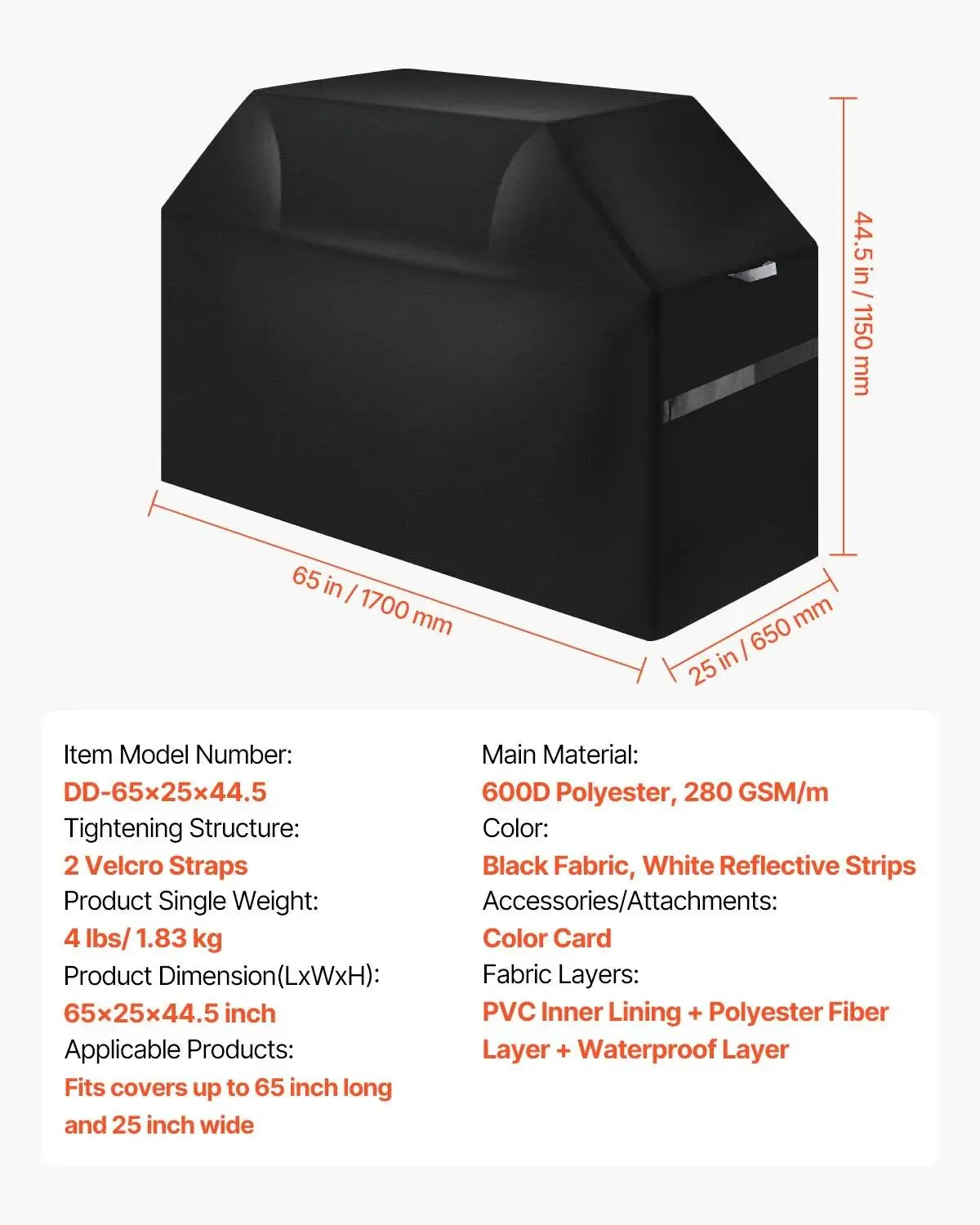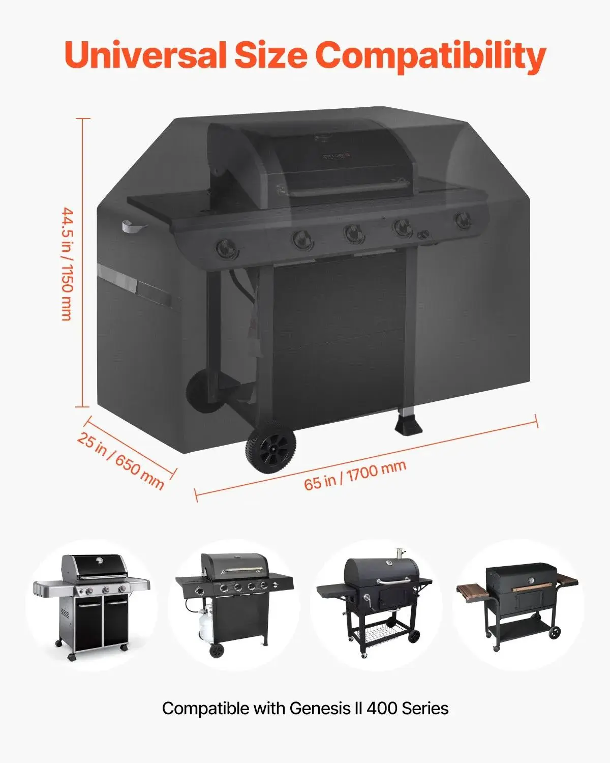 The BBQ gas grill cover dimension is 65x25x44.5 inch. The universal grill cover fits most grills. Simply measure your grill to find the perfect-fitting cover. NOTE: This product does not include a grill.