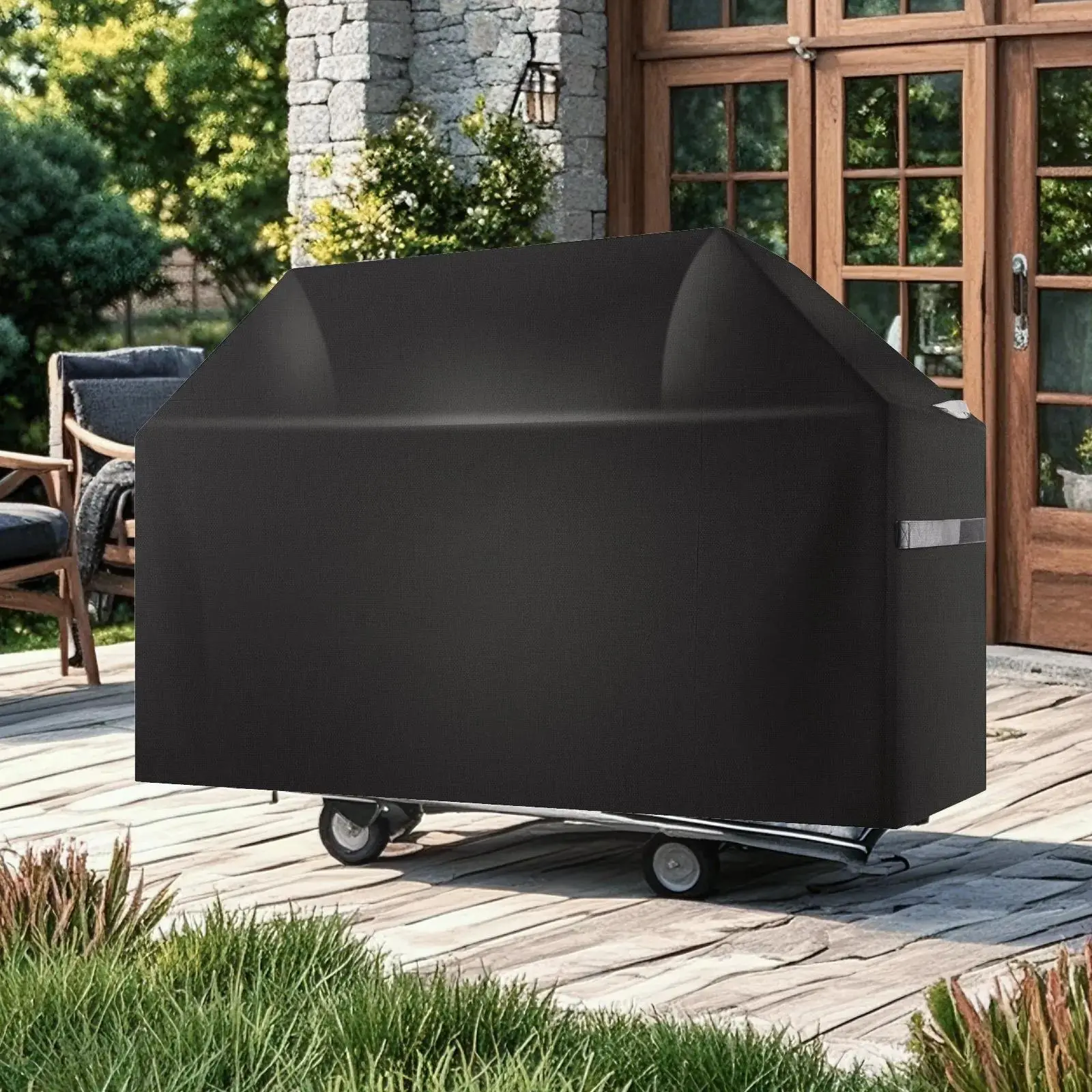 The barbecue cover uses a PVC lining + polyester fiber layer + waterproof layer. All seams are reinforced with waterproof strips and coated with sealing glue. It provides five layers of waterproof guard, with water resistance up to 800cmH2O. It completely blocks rainwater penetration, extending your grill's lifespan.