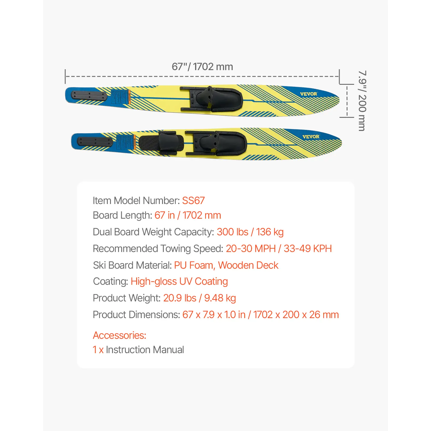 VEVOR 67" Water Skis,  Adult Water Ski with X-9 Adjustable Horseshoe Bindings & Padded Rear Toe Plate, High-gloss UV Coating Waterskis Combo for Adults Up to 300 lbs