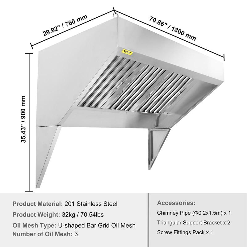• No More Cloudy Smoke: Quality stainless steel commercial exhaust hood boasts 2 more smoke-locking tripods than the ordinary exhaust hood. With 70.86-inch large space for smoke capture, our exhaust hood can be used with more than 2 cooktops at the same time, while making sure the oil smoke will not spread around. Wide smoke capture area effectively removes a large amount of smoke and cooking smell in the air.