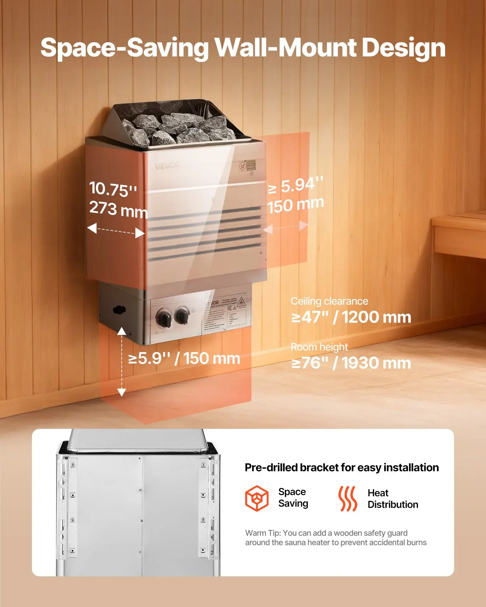 The electric sauna stove features a simple wall-mount design with pre-drilled brackets and reserved screws. Mounting it 3.5 inches/88.9mm from the floor ensures better heat flow, reliable operation, and efficient use of limited floor space.