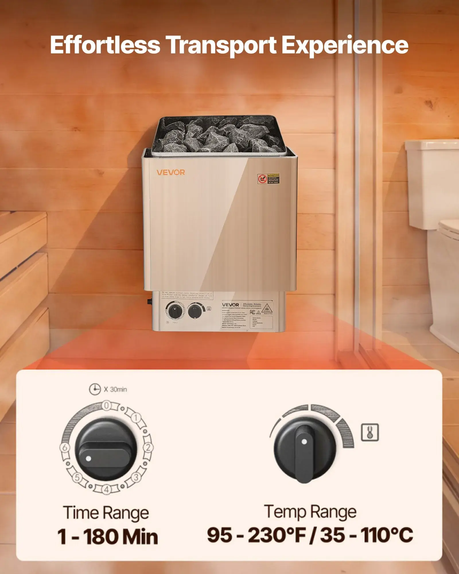 Equipped with mechanical dials, this steam bath stove allows simple temperature and duration control. With a maximum of 230℉/110℃ and a timer up to 3 hours, you can personalize each session. Enjoy a comfortable and enjoyable sauna experience.