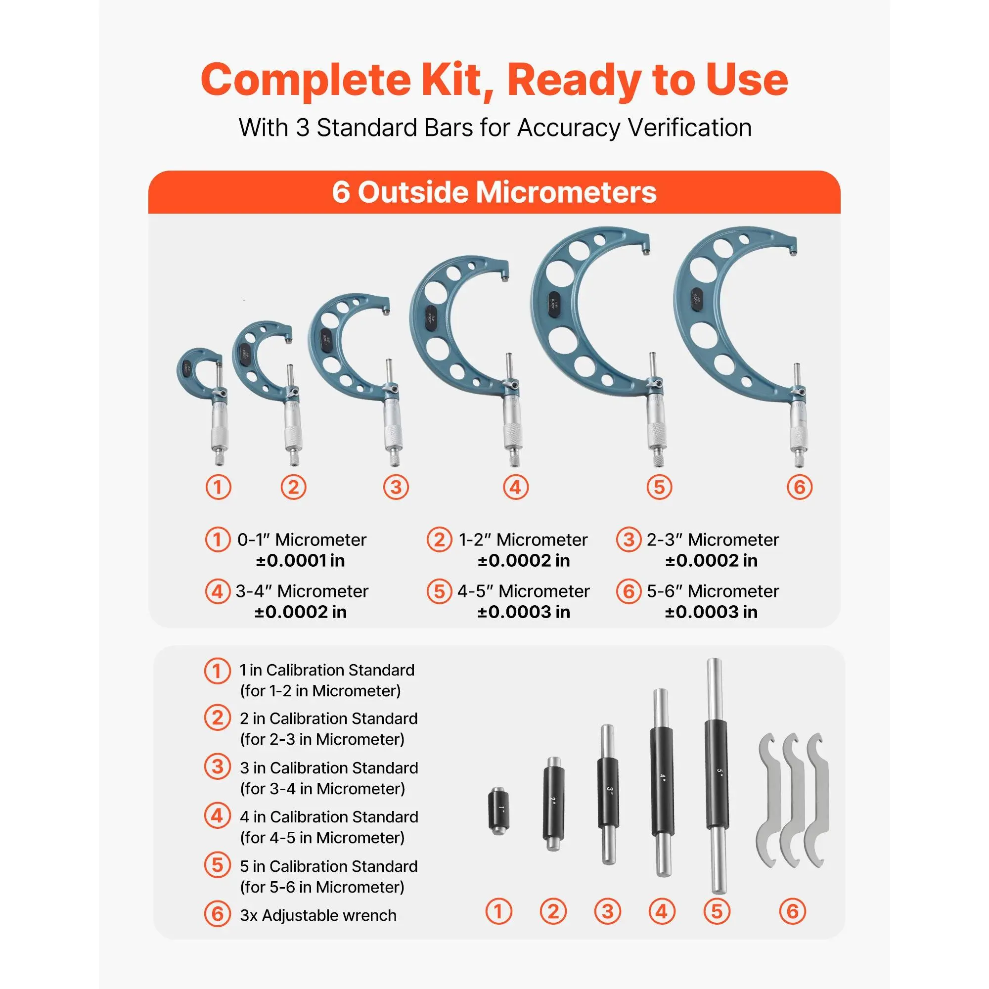 High-Precision Micrometer Set: This micrometer set offers ±0.0001 in, ±0.0002 in, and ±0.0003 in accuracy, with six micrometers Caping 0-6 in and five calibration rods for verification.Ideal for reliable measuring engine or precision componentsEasy-to-Read & Intuitive Operation: This micrometer set features clear sleeve markings and a zero-adjust wrench, making dynamic adjustments simple.The smooth spindle ensures easy sliding for quick part positioning, maintaining measurement accuracyPrecise Performance: Built with a carbide-tipped measuring face, this digital micrometer ensures long-lasting accuracy and wear-resistance.The lock nut avoids slippage, while the ratchet thimble offers smooth control and stable precision over timeVersatile for Multiple Tasks: This micrometer measuring tool features a solid metal frame for wear resistance and lasting stability.Ideal for measuring outer diameters of pipes, metal sheets, and other parts in machining or precision workComplete Set Included: This micrometer digital comes with a dedicated hard case containing six micrometers, five calibration rods, wrenches, and instructions. Keeps tools organized and portable, ready for precise measurements right out of the boxVEVOR 6 PCS Micrometer Set, 0-1"/1-2"/2-3"/3-4"/4-5"/5-6" Machinist Outside Micrometer, Precision 0.0001 Accuracy, Professional Machinist Tools with Protective Case, for Metalworking & Engineering