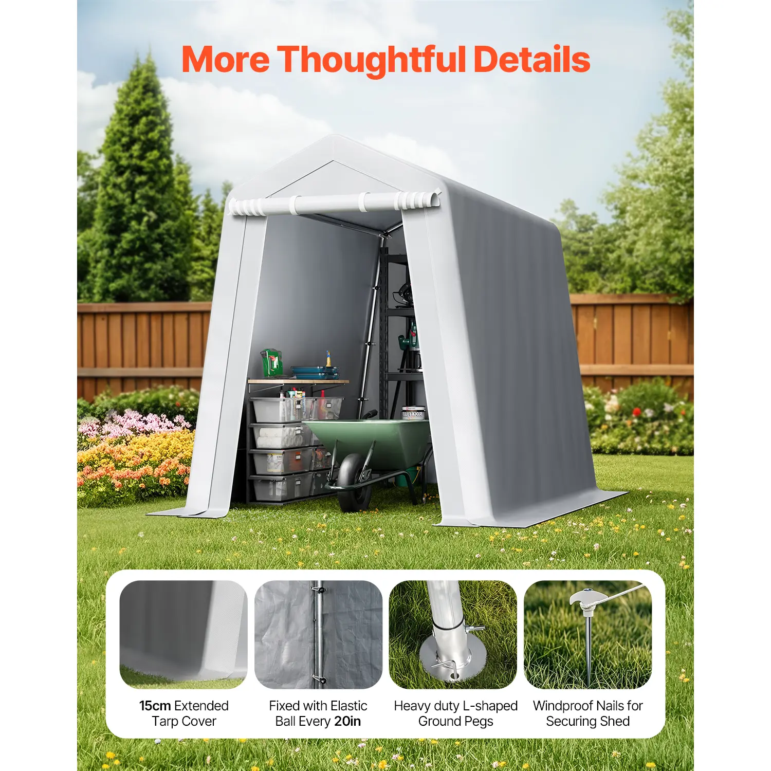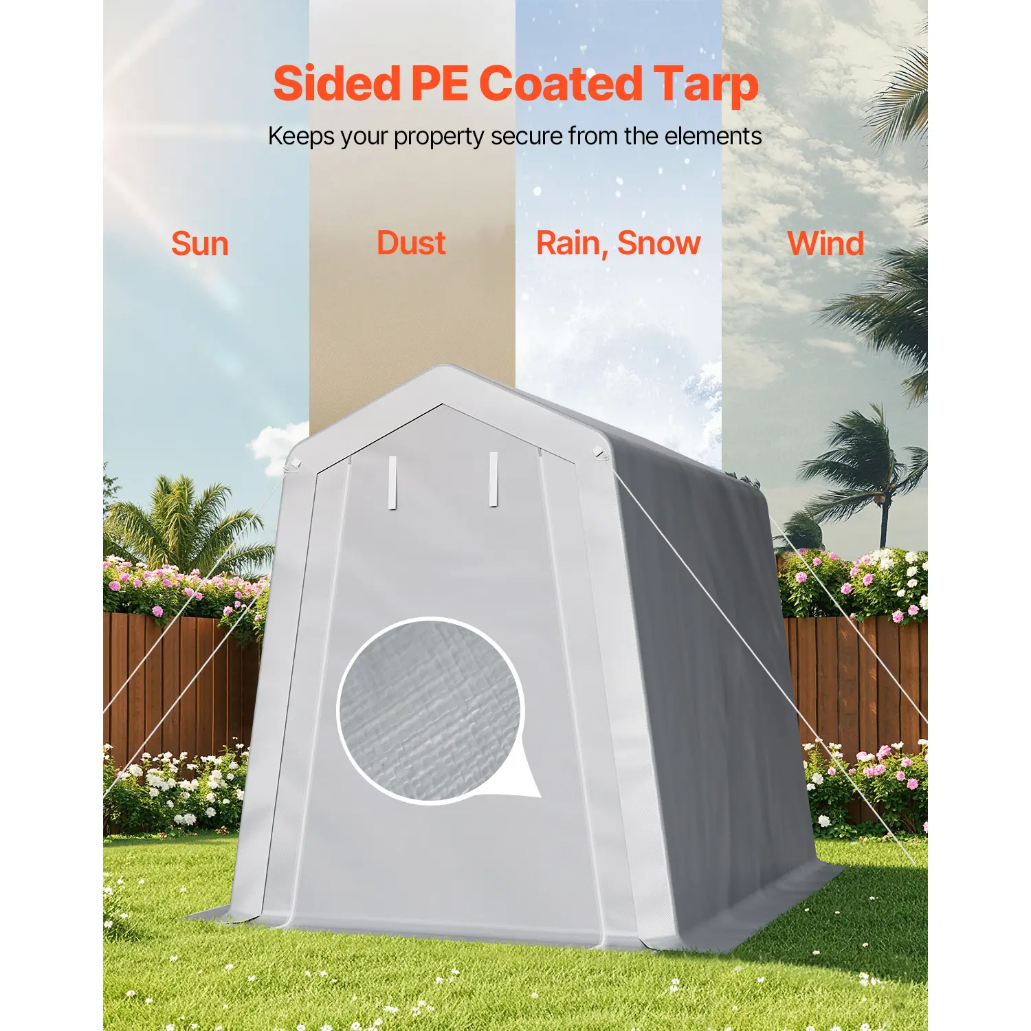 • Zipper Door Design: Flexible to seal or roll up. When sealed, the zipper fits snugly, fully protecting your items from dust, moisture, and other external factors. To access your items, simply roll up the zipper door for easy and quick access to your canvas storage sheds.