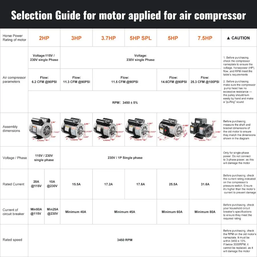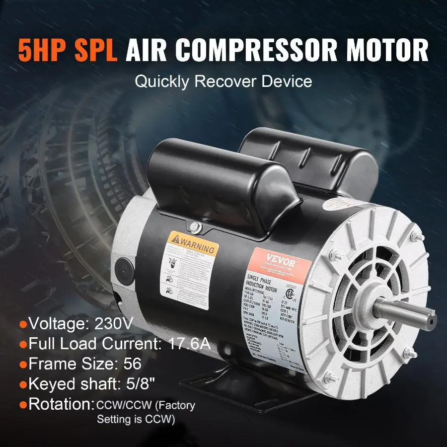 VEVOR 7.5HP Air Compressor Motor, 230V 31.6 Amps Electric Motor, 3450RPM 184T Frame, 1 - 1/8 Keyed Shaft, 2.75 Shaft Length for Air Compressors, Single Phase, CCW/CCW (Factory Setting is CCW)VEVOR 5HP SPL Air Compressor Electric Motor, 230V 17.6Amps, 56 Frame 3450RPM, 5/8" Keyed Shaft, 1.88" Shaft Length, CW/CCW Rotation (Factory Setting is CCW), Single Phase Powerful Motor CW/CCW Rotation Direction Efficient Cooling Safety Certification High-quality Frame Safety
