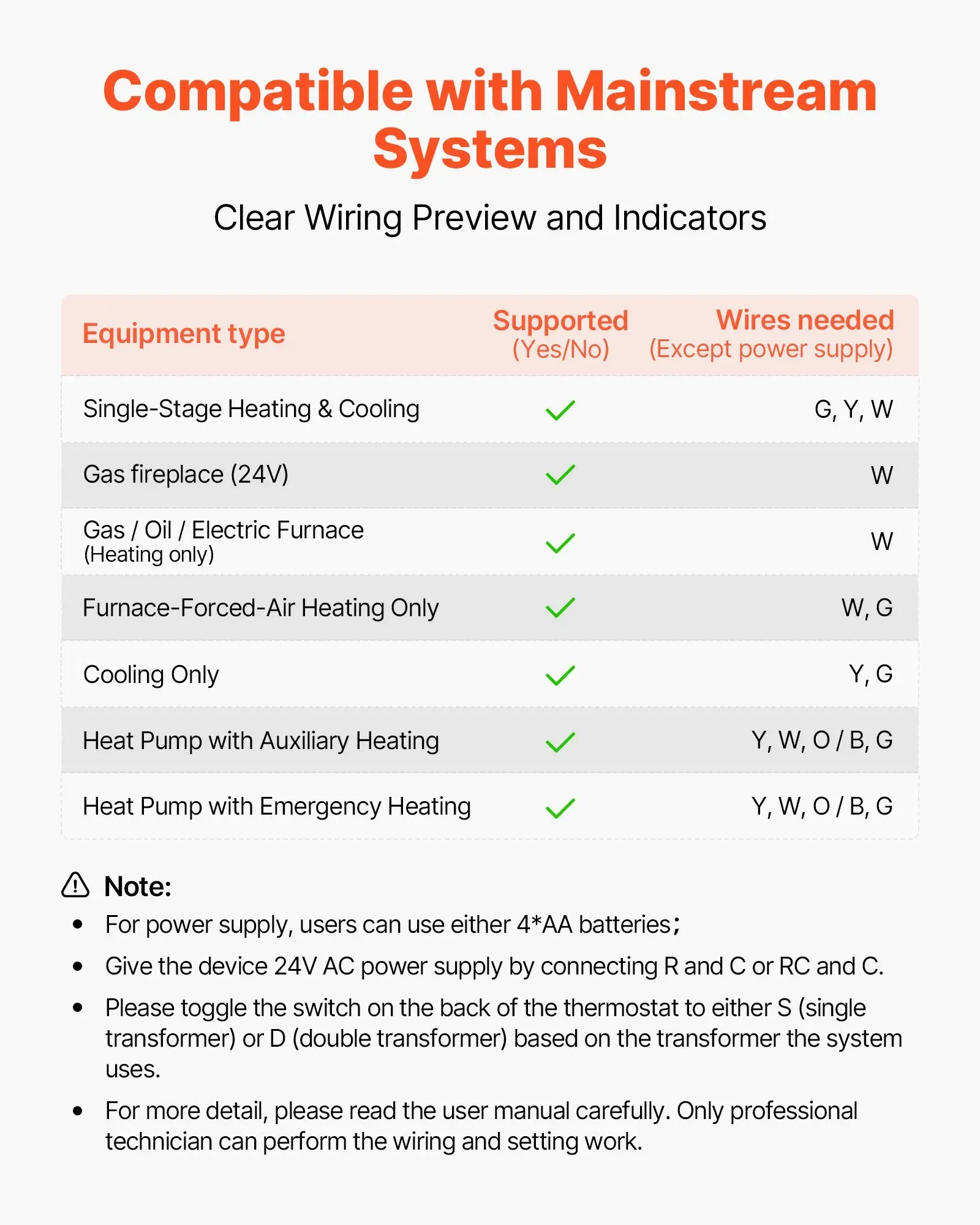 ·🏠 This home thermostat works with underfloor heating, snow melting, AC, heat pumps, gas, and water heating systems. It uses floor/indoor sensors for temperature control. Requires a dry battery or 24V wiring.