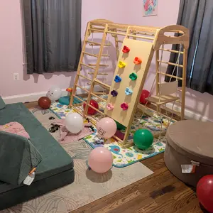 • 100% Solid Wood Construction: Made from solid wood, the toddler indoor playground has a smooth, burr-free surface, with all edges rounded to reduce the risk of sharp-edge injuries, ensuring comfort and safety for children during play. The carefully applied paint is odorless, giving parents peace of mind. This high-quality material ensures durability and fosters children's awareness of environmental protection.