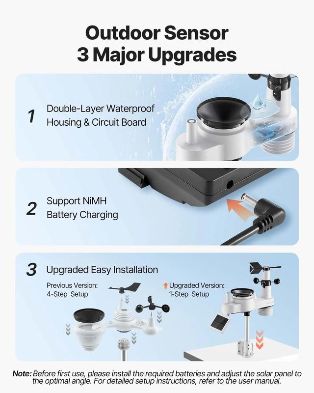 ·7-in-1 Outdoor Sensor: Monitor temperature, humidity, rainfall, wind speed, direction, sunlight, plus dew point, moon phases, and 6-12 hour forecasts—all from home (displayed on indoor display). 4 major upgrades: 1. The internal components have been comprehensively upgraded to better resist rainwater intrusion. 2. Supports NiMH battery charging. 3. Supports SmartLife App, no need to register with weather websites, and no ads or paid plans. 4. Simplified installation saves you valuable time