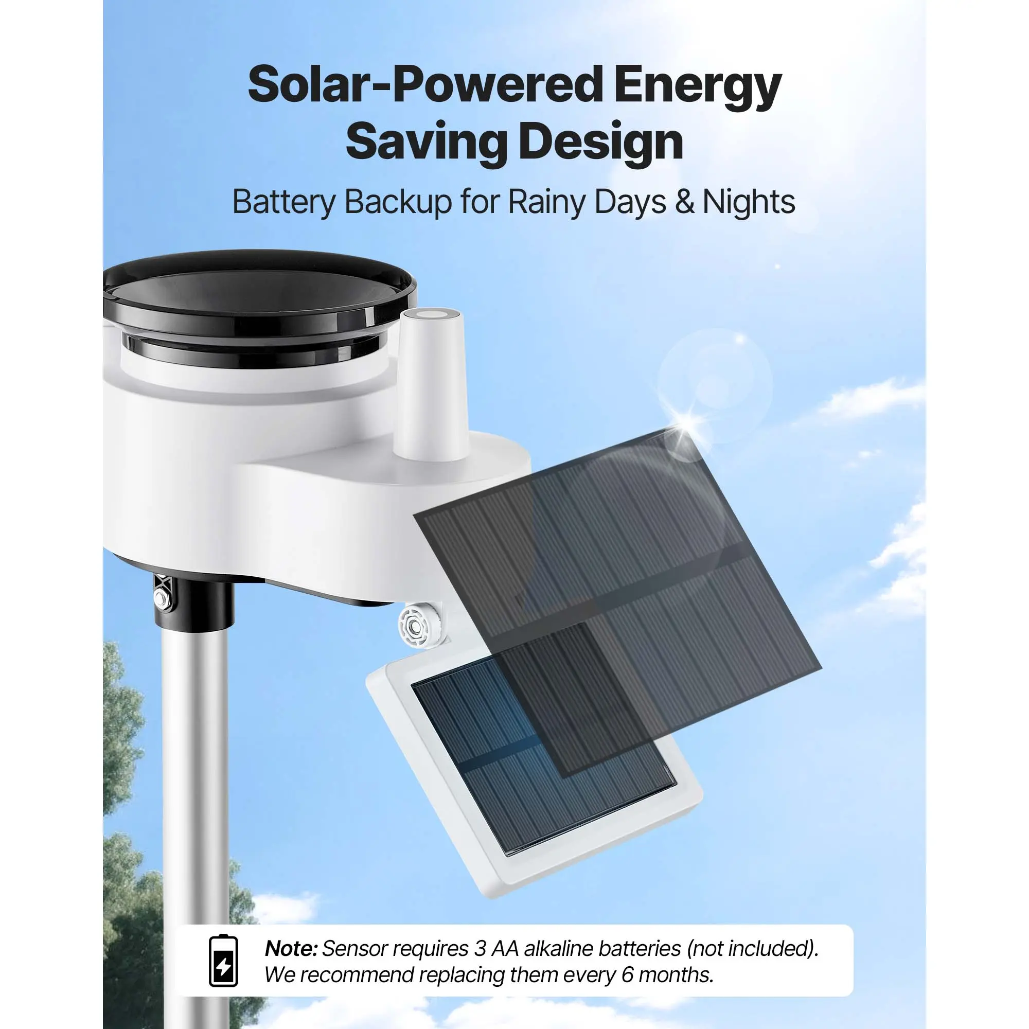 • Solar Powered, Built to Last: High-efficiency solar panels absorb solar energy during the day and charge the battery at night—cutting energy costs. Our digital weather station comes with an aluminum alloy rod fixed bracket for long-term use