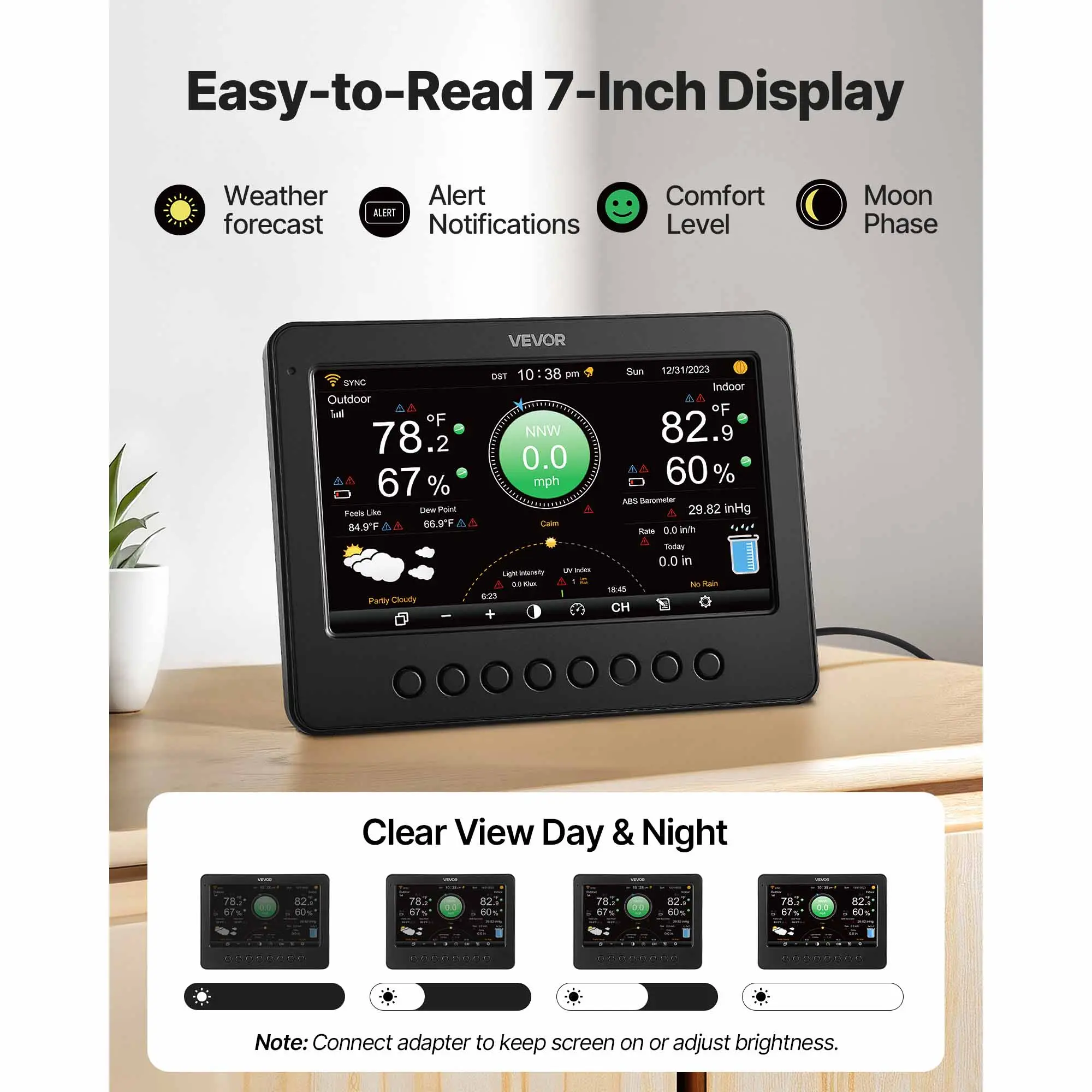 • 7-Inch HD Display: Enjoy a crystal-clear view of all your weather data with our wireless weather station. The large display with 4 brightness levels fits well in your living room or bedroom for day or night reading