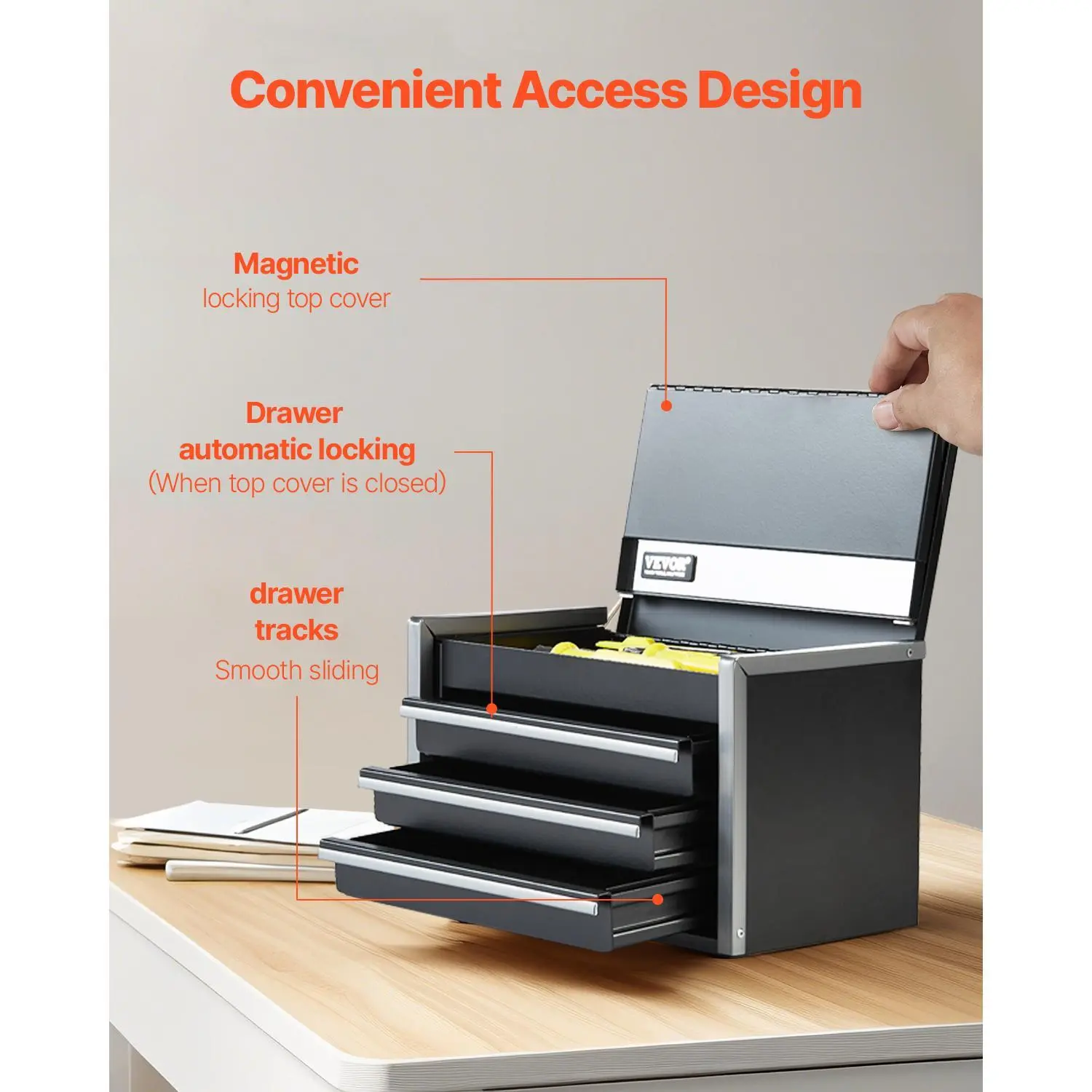 • Convenient Opening & Closing: The top cover features a magnetic locking design. Simply close the top lid to keep the drawer toolbox securely locked, ensuring the drawers won’t accidentally slide out during movement and avoiding items falling. The smooth sliding drawers provide easy access without any sticking, allowing for smooth and stable opening.