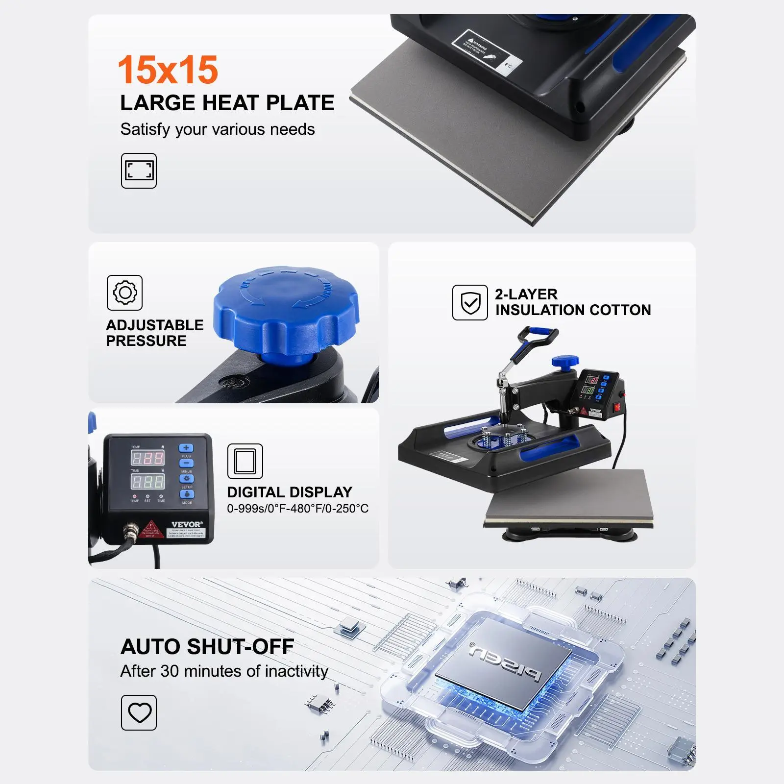 • Dual Tube Heating: The shirt press uses advanced dual tube heating technology for quick heating and more even heat distribution, ensuring every inch of the press area reaches the ideal temperature. This improves the uniformity, clarity, and color fidelity of the transferred designs.