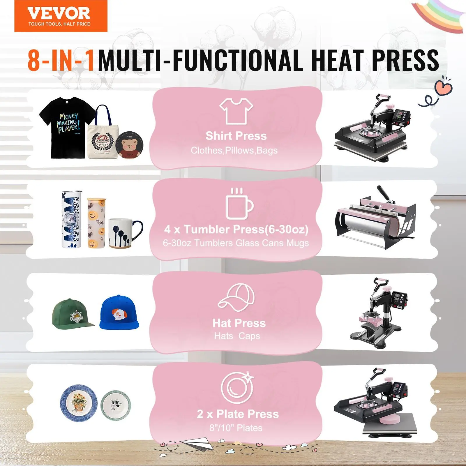 • Versatile Heat Press: The 8-in-1 multifunctional heat press machine comes with multiple attachments, allowing your creativity to expand without limits. Whether you want to transfer beautiful designs onto T-shirts, pillowcases, hats, mugs, or ceramic plates, our heat press makes it easy. It is equipped with 6oz/12oz/17oz/30oz tumbler press attachments. The upgraded 30oz large size can handle two mugs at a time, greatly enhancing work efficiency!
