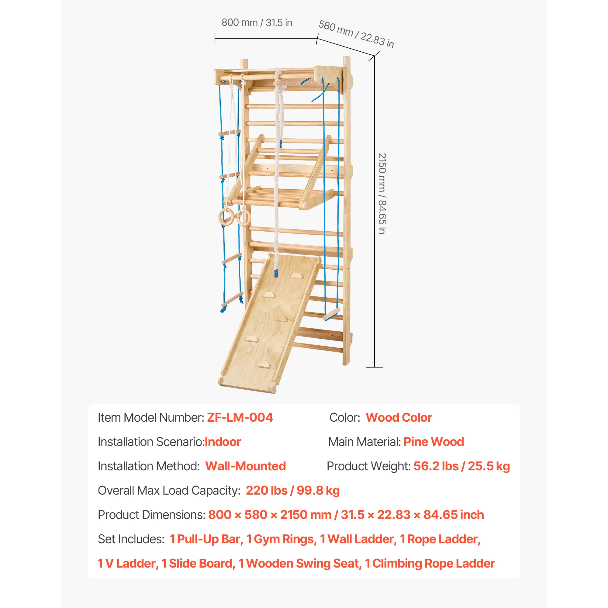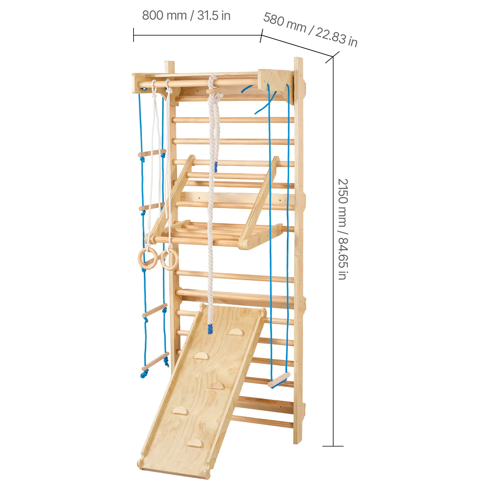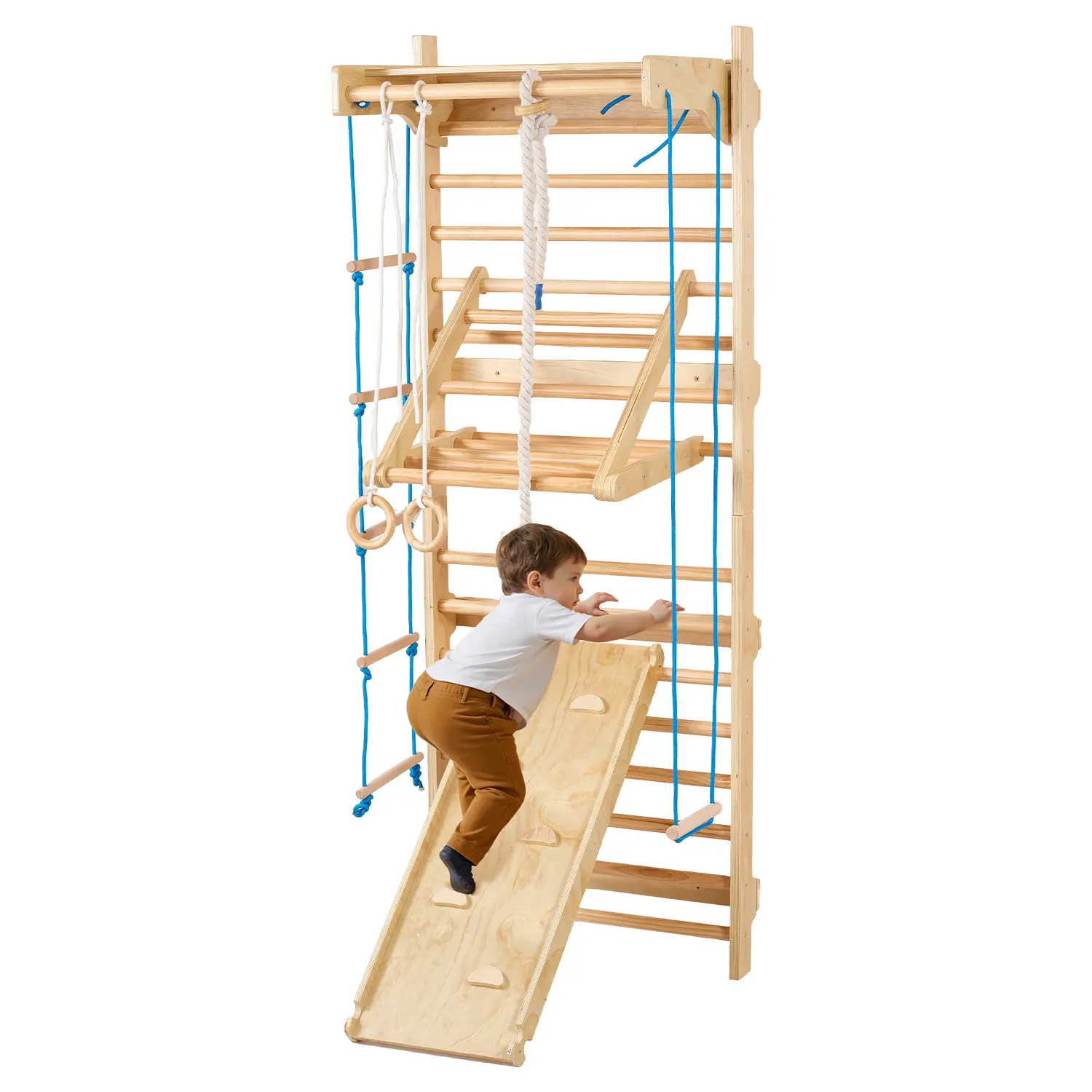 This 8-in-1 Swedish ladder playset includes a pull-up bar, gym rings, swing seat, climbing rope ladder, wall ladder, V ladder, and slide board. It builds physical strength, coordination, and confidence through active play. Transform your home into a fun-filled indoor playground. Kids will enjoy various activities, enhancing their skills and confidence.