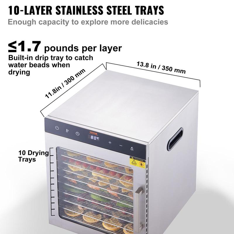 • 10-Layer Stainless Steel Trays: This food dehydrator has ten stainless steel trays that are food-grade 304 and measure 11.8 x 11 inches / 300 x 280 mm each. Each layer can hold up to 1.7 pounds of food, so you can dry different types of fruits and vegetables all at once.
