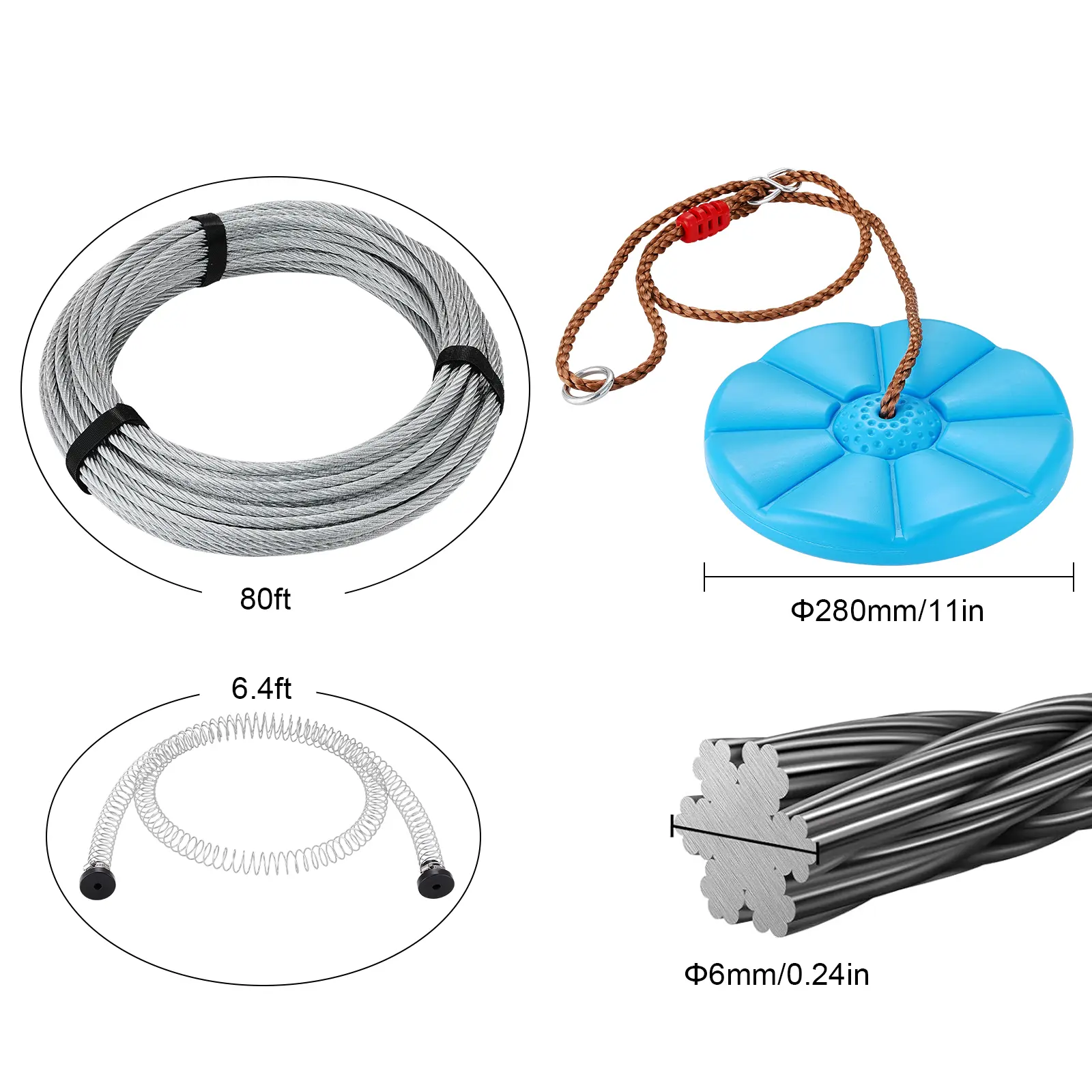 • Extended Spring Brake System: The 6.4 ft extra-long spring brake, made of stainless steel with moderate hardness, offers higher resilience and durability. As a result, the high-altitude zip line won't come to a sudden stop. The spring brake system effectively maintains the distance between children and trees, ensuring safety.