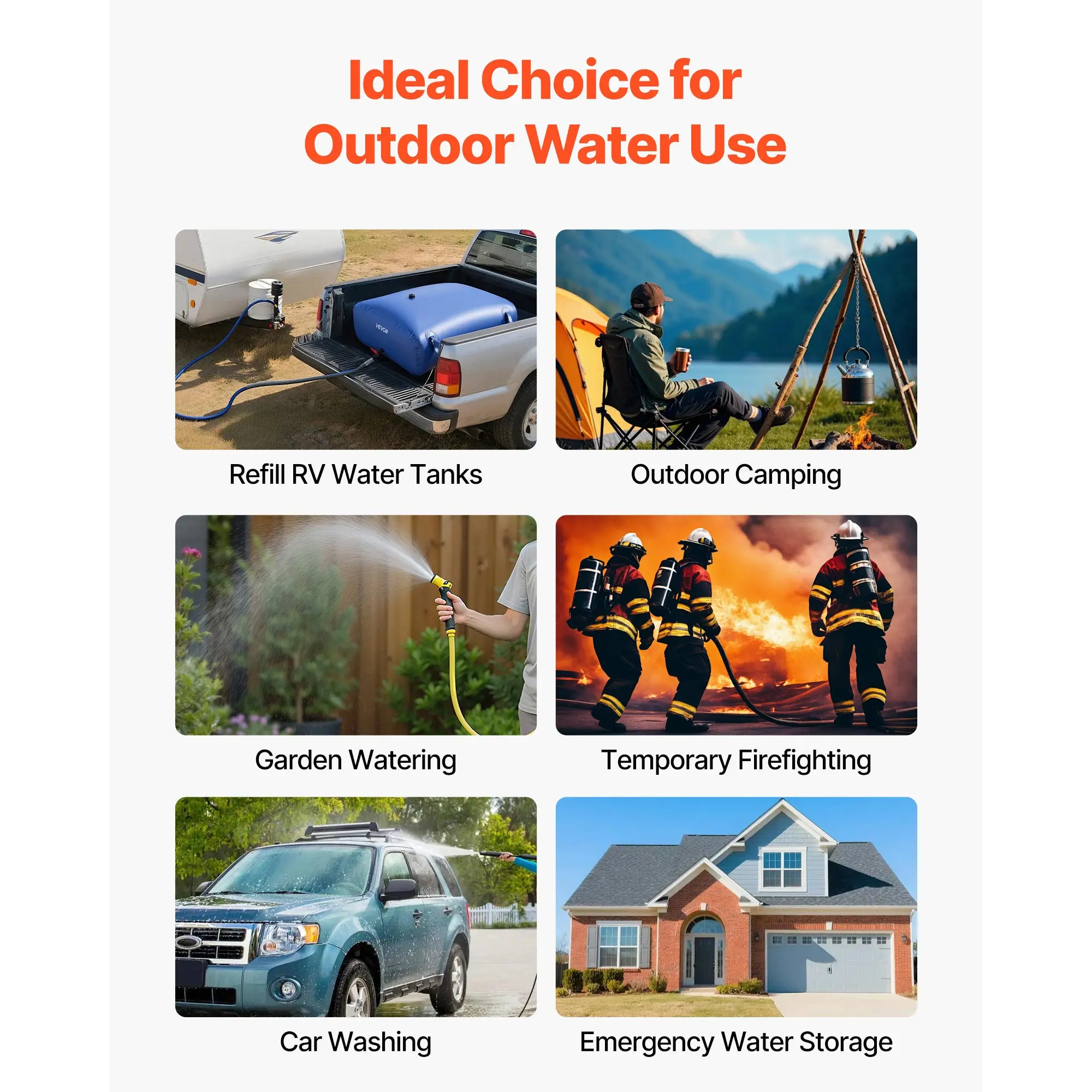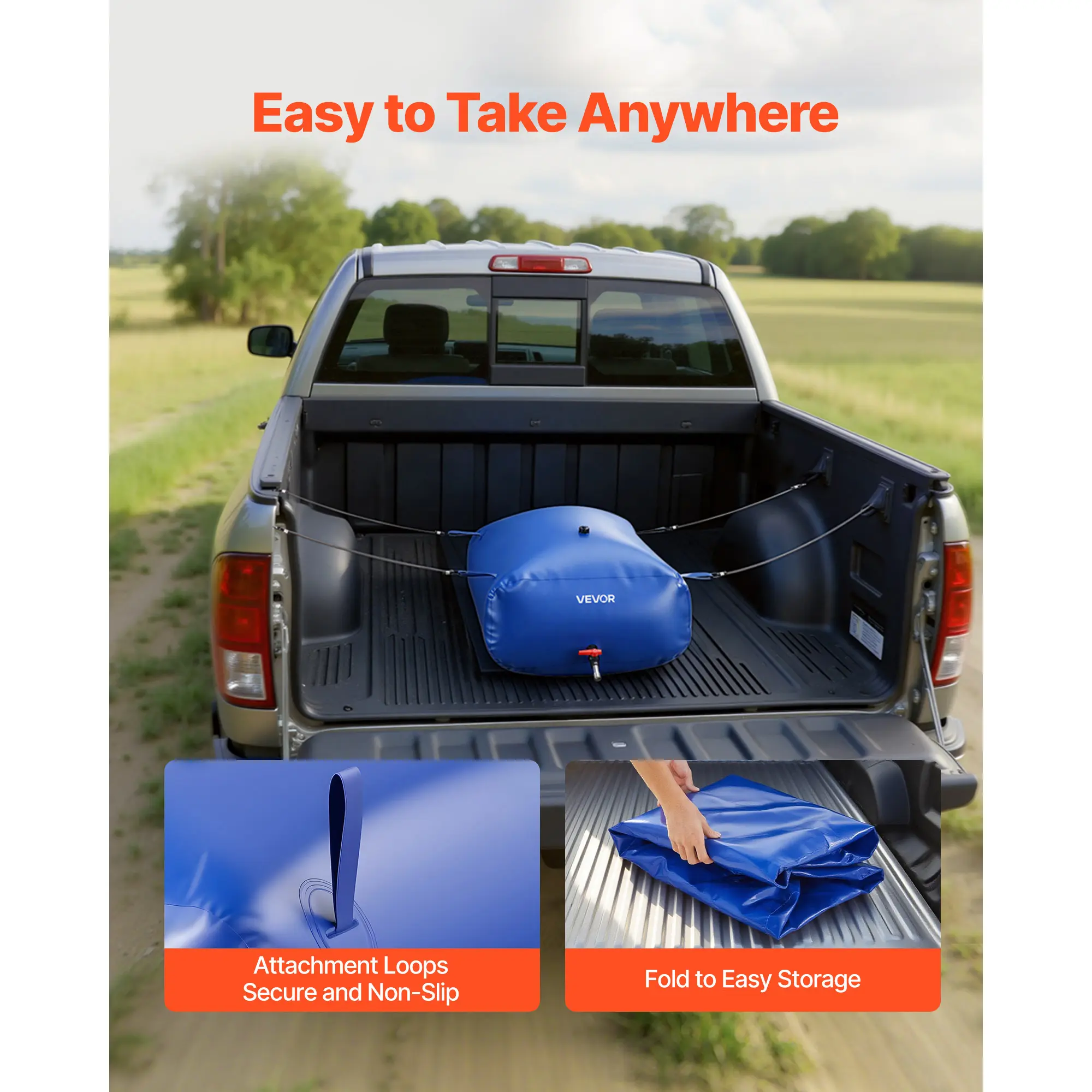 • Portable & Easy to Store: The portable water bladder comes with four reinforced carry loops allow secure placement in pickup beds, SUVs, or on the roof for safe transport. Flexible PVC material folds flat for compact storage when not in use, eliminating the need for bulky water tanks