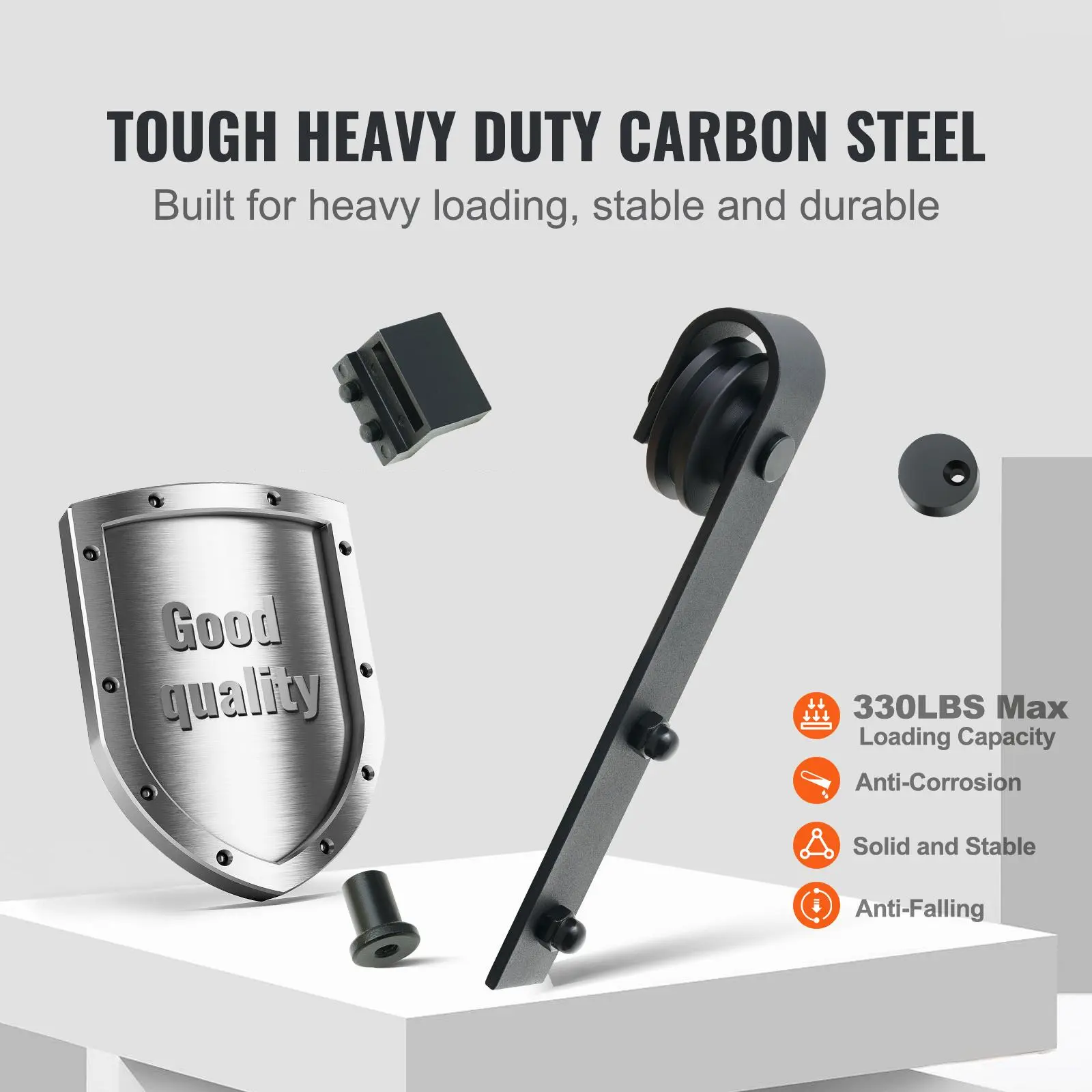 • 2-Section Tracks Sliding System: VEVOR 8ft J-shaped sliding barn door hardware kit comes with 2-section tracks, making the assembly exceptionally simpler and safer. This heavy duty barn door hardware kit can easily hold up the barn door track without shaking, while the low clearance barn door hardware system requires less space above the doorway, both stable and space-saving!