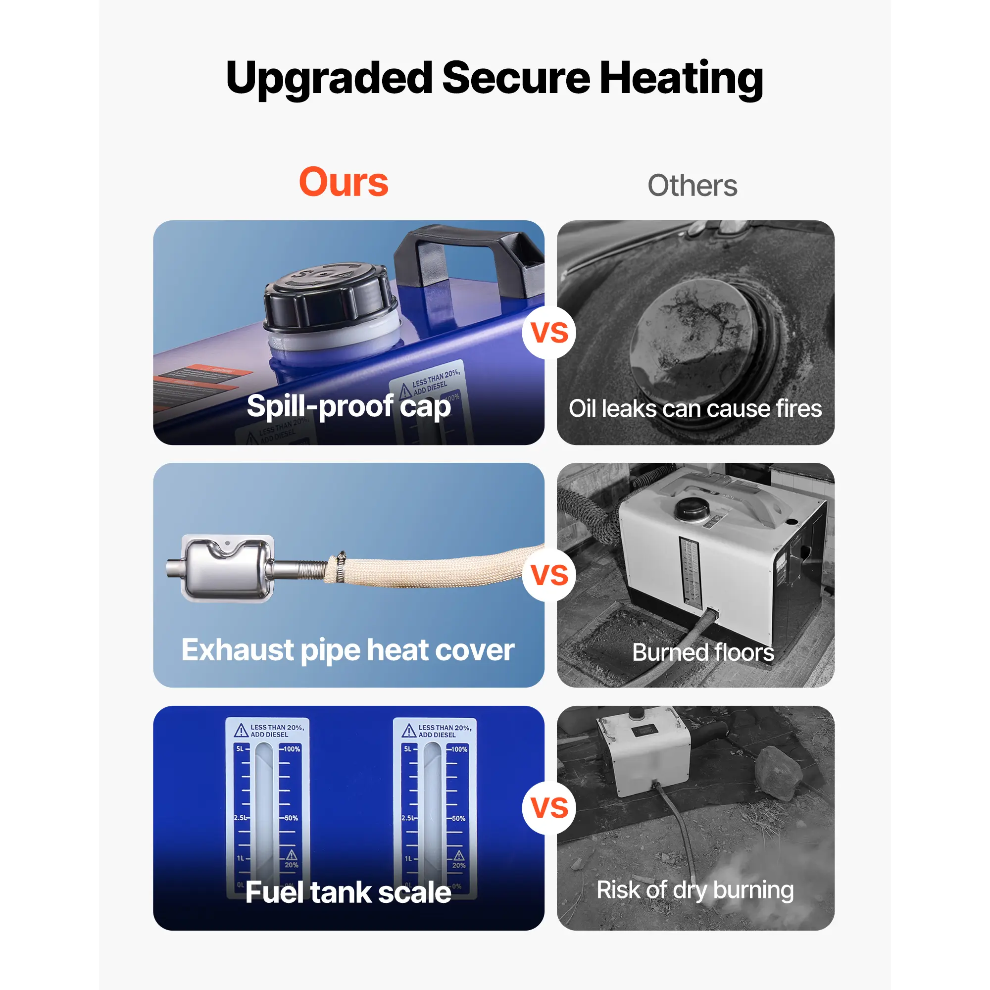 • Security Features: This diesel air heater features exhaust pipe heat sleeve to reduce floor damage risks. The sealed fuel cap ensures secure long-term use. Built-in protections include overheat shutoff (≥536℉), reverse polarity, and overvoltage