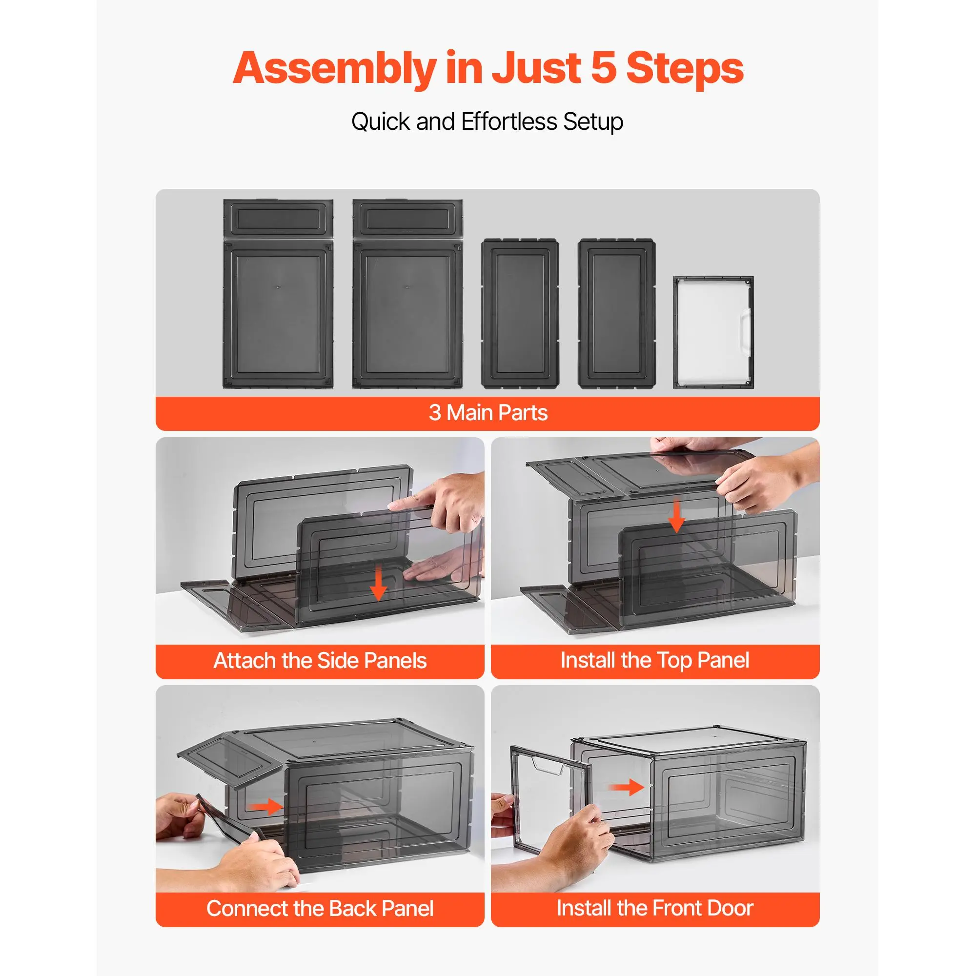 • Quick, Tool-Free Assembly: No complicated setup – just 5 easy steps to assemble. The plastic shoe organizer fits up to US Size 13 shoes. The transparent body and front door make it simple to spot your shoes, keeping your space neat and organized