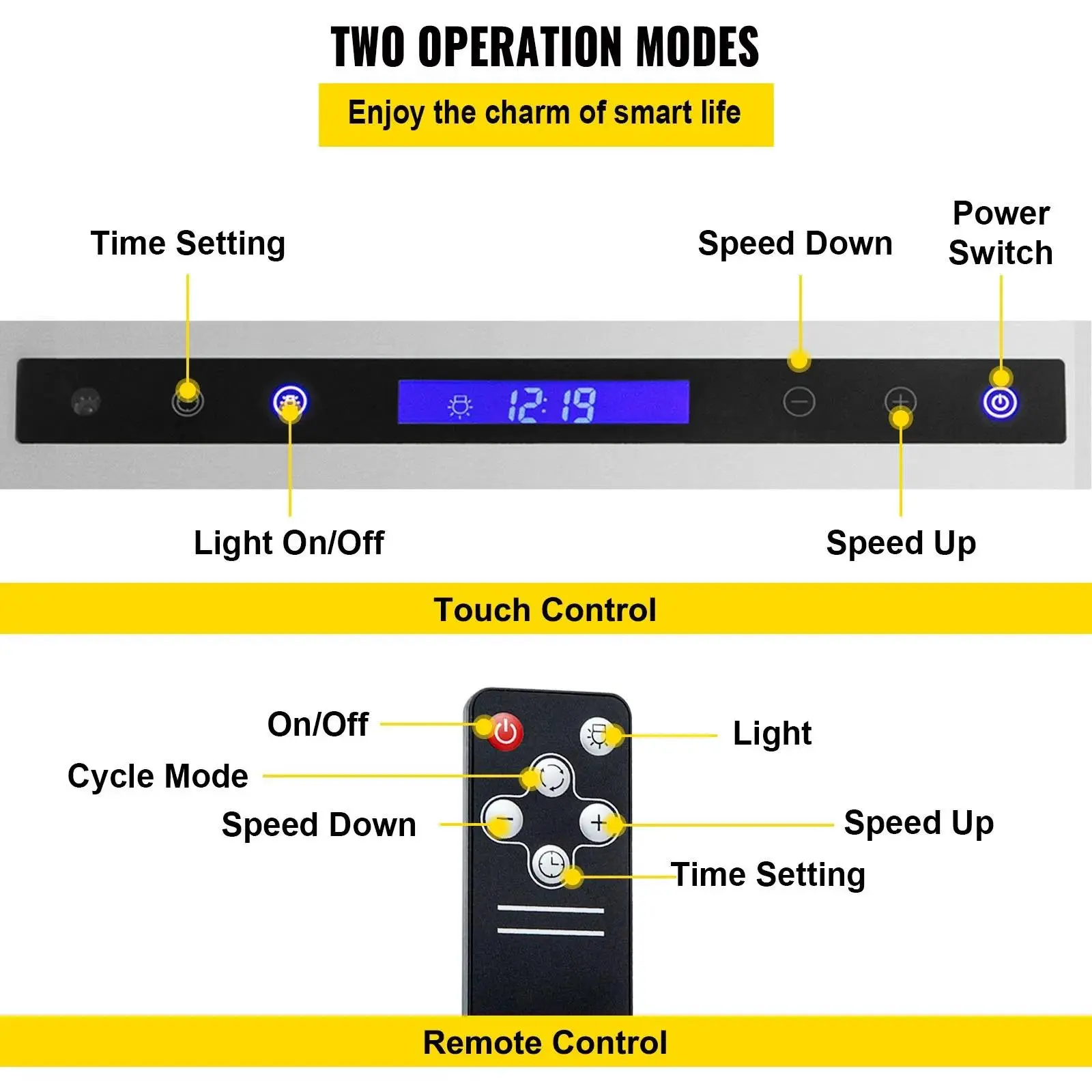 Control Options- Touch Control: Acrylic smart screen for easy mode selection- Remote Control: Convenient operation from a distance- Speed Adjustment: 4-speed settings for customizable ventilation- Lighting: 3W LED lamps for bright, energy-efficient lighting