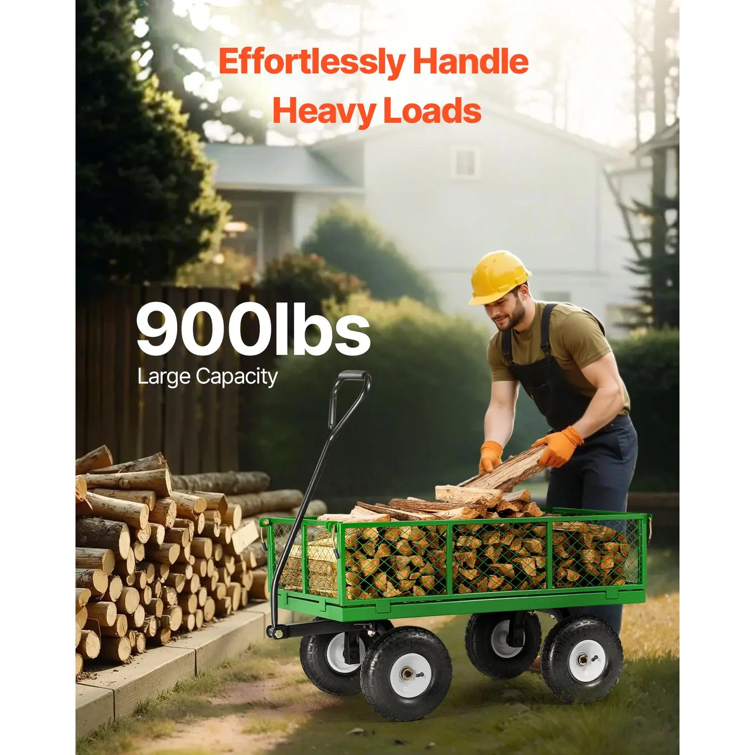 • 900-lb Load Capacity: This garden cart is specially designed for transporting heavy items with ease. Whether you're moving soil, stones, or heavy tools, its 900-lb capacity allows you to carry everything in one trip, reducing back-and-forth effort and making your tasks more efficient and hassle-free.