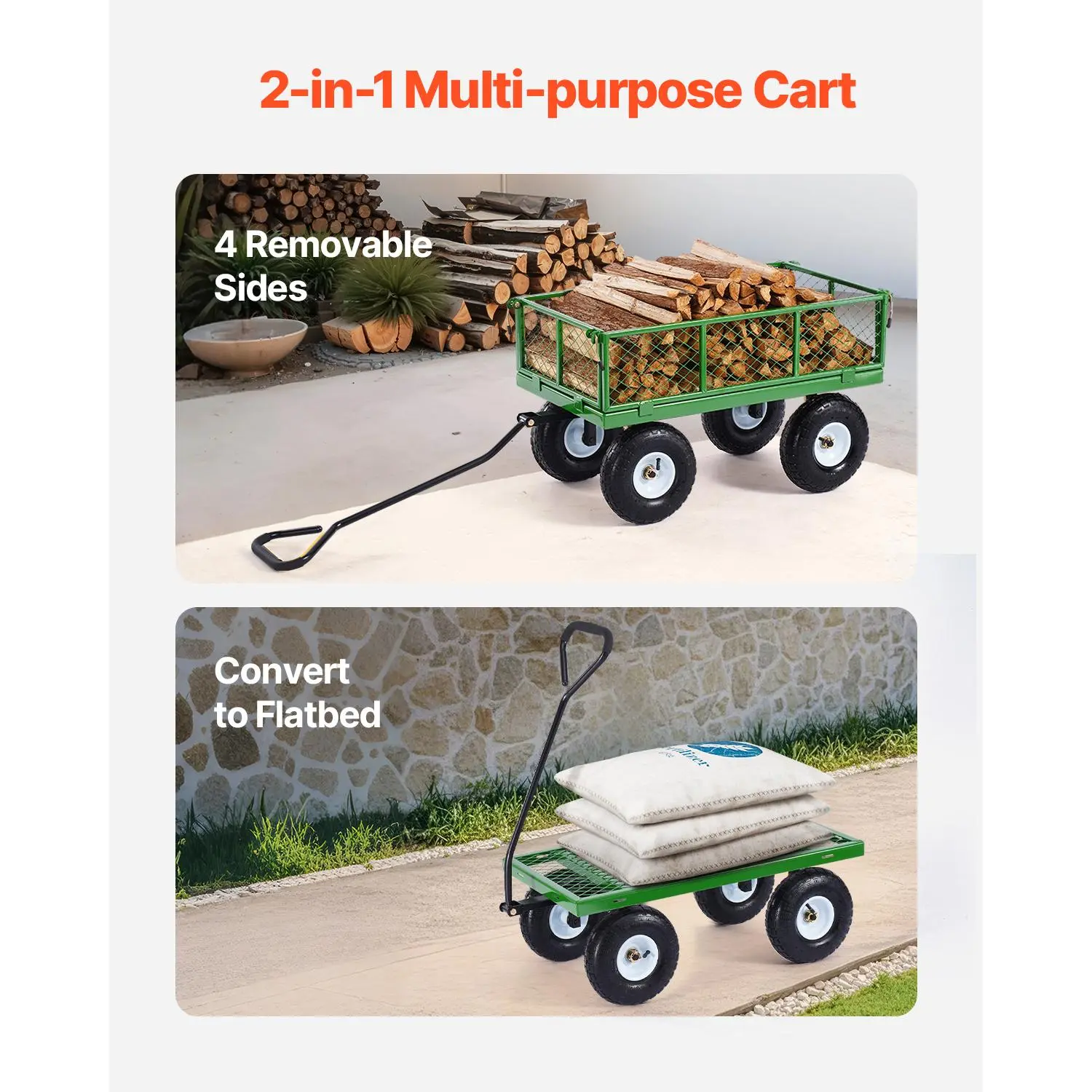 • 2-in-1 Multipurpose Design: With convertible modes as a fenced cart and a flatbed cart, this versatile garden cart wagon adapts to a variety of tasks. Whether you're hauling loose materials or bulky items, it handles them effortlessly. Its 4.52 cu. ft. load bed provides ample space for all your gardening and transportation needs.