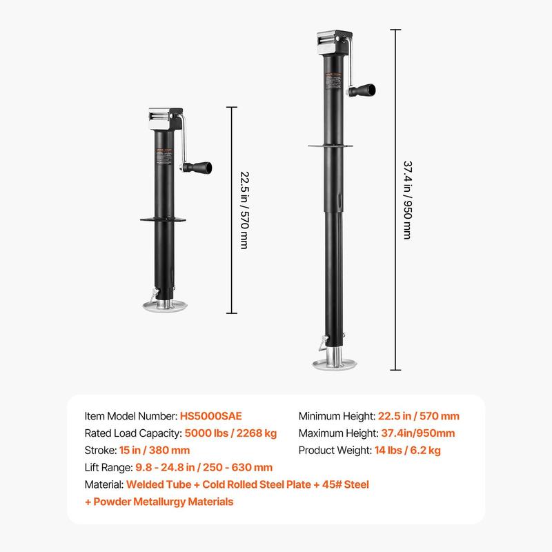• Heavy-Duty Load Capacity: The trailer jack boasts an impressive lifting capacity of 5000 lbs, making it a powerful tool for lifting tasks. With a lifting range of 9.8 to 24.8 inches, it fits both high-profile and low-profile trailers.