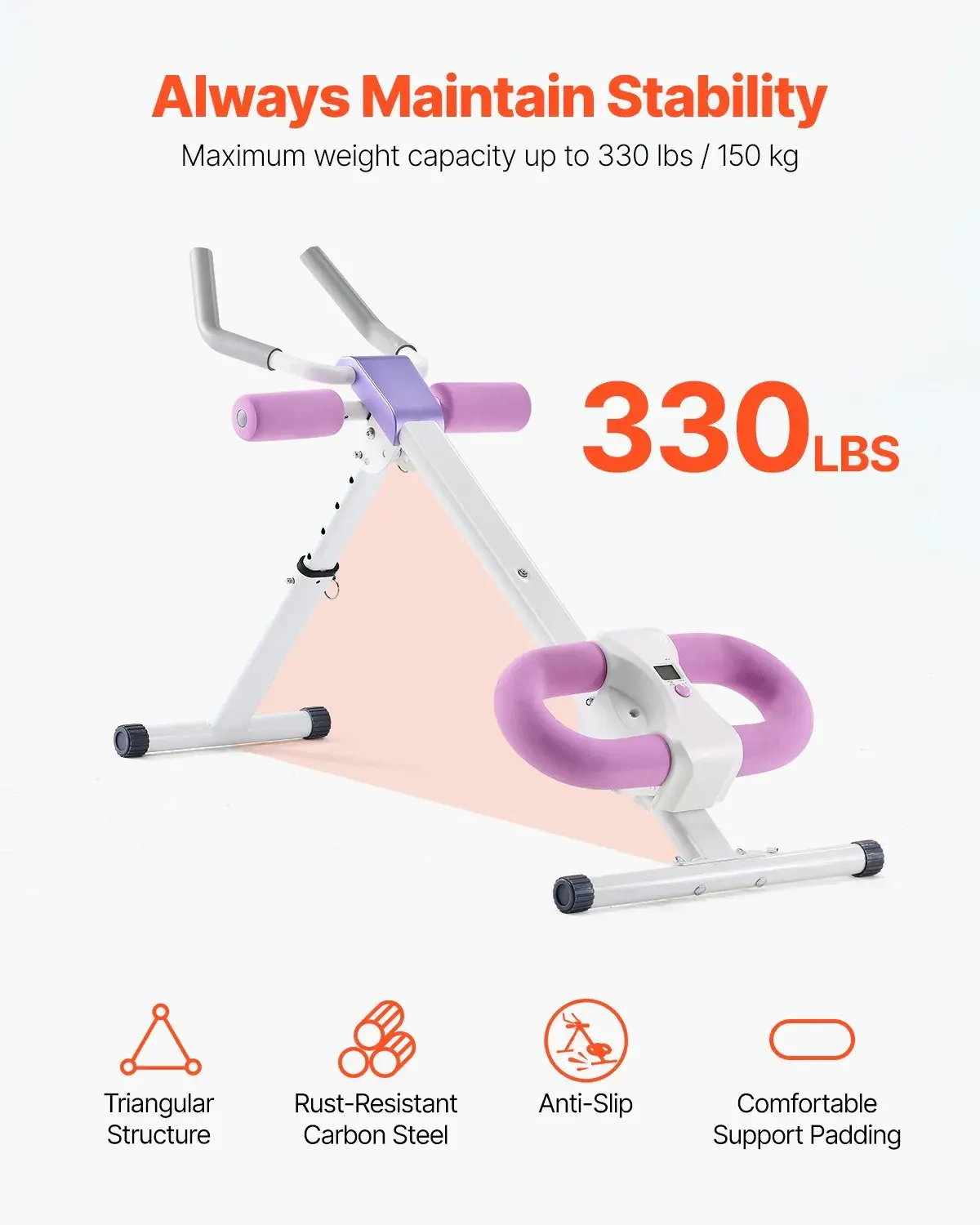 With a maximum weight capacity of 330 lbs / 150 kg, the stable triangular structure is built with heavy-duty carbon steel. It features a U-shaped foam knee pad and padded handles, reducing body movement and knee friction. This ensures high durability and comfortable workouts.