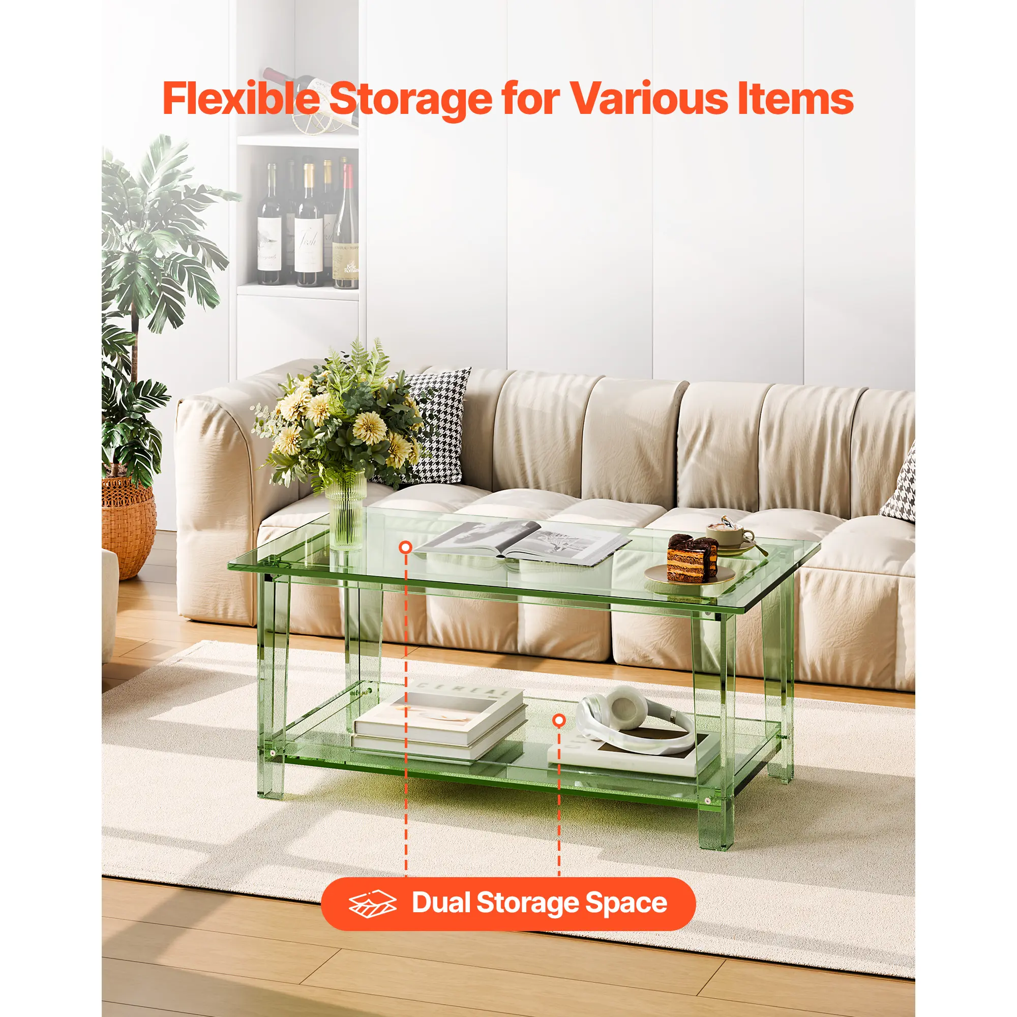 • Dual Storage Space: This acrylic coffee table features spacious 2-tier storage for laptops, books, documents, and décor. The transparent tabletop offers an unobstructed view, making it easy to find what you need—ideal as a coffee table or computer desk