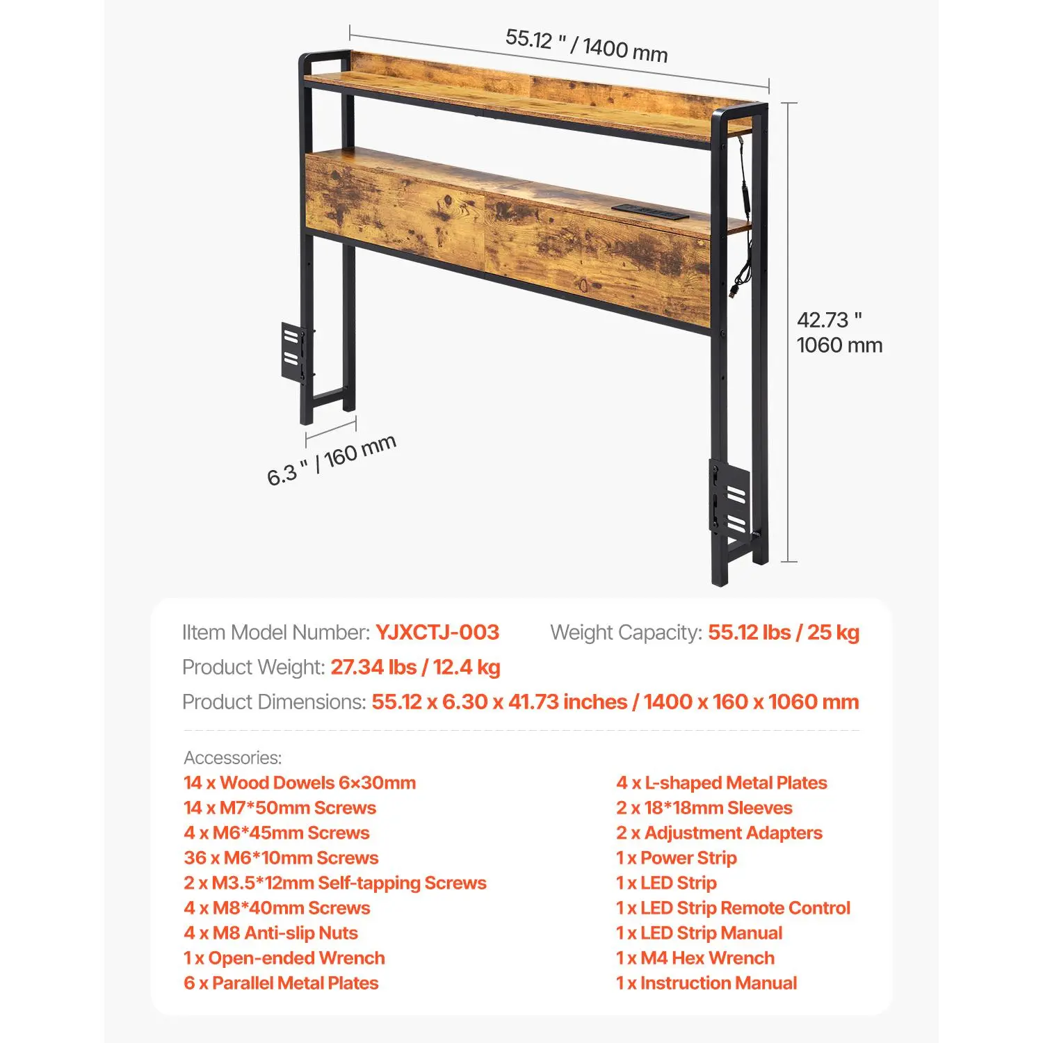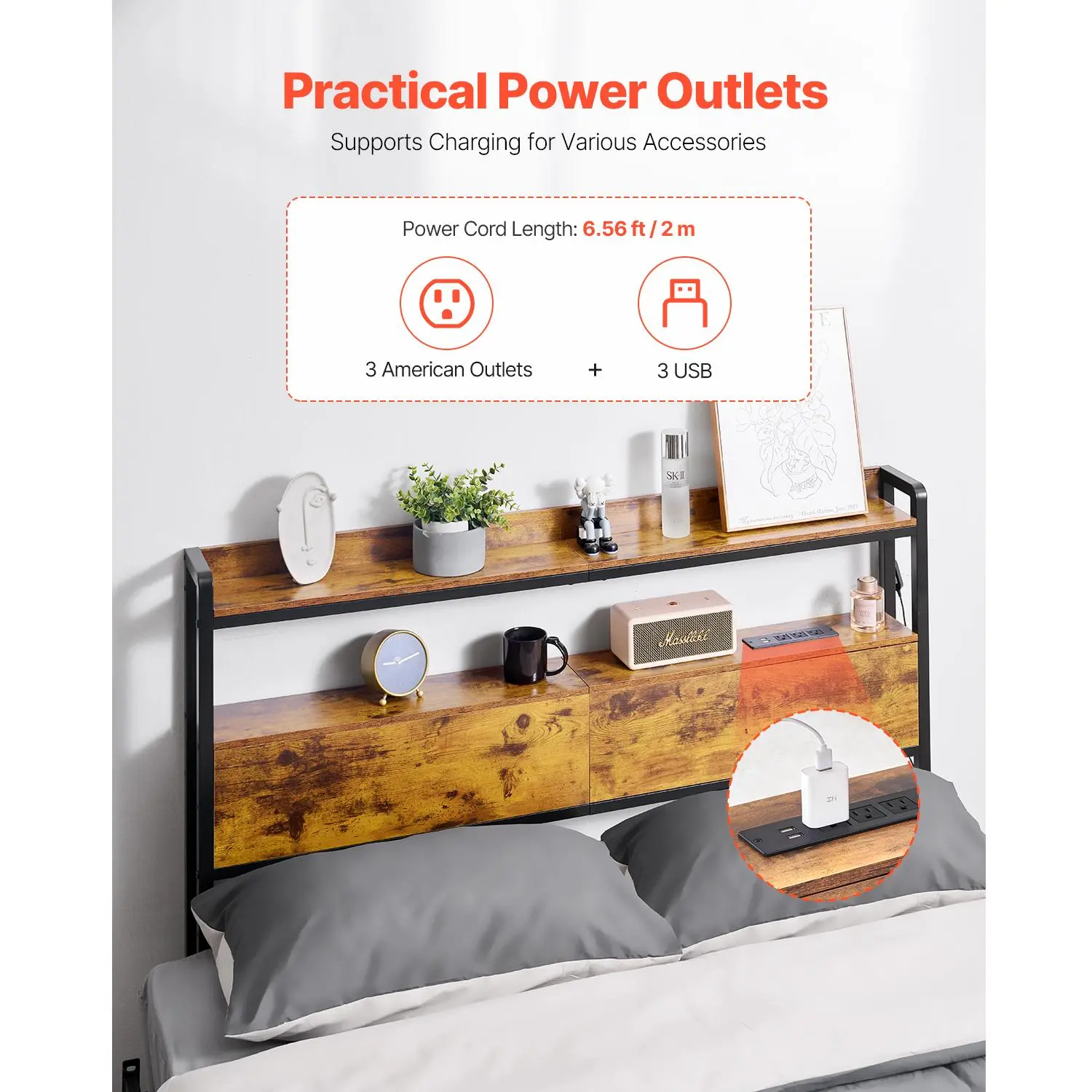 • Convenient Charging: No more messy cables! Each side of our headboard has its own power strip with a 6.56 ft / 2 m cable, so you can easily charge your phone or plug in your bedside lamp – all without the hassle.