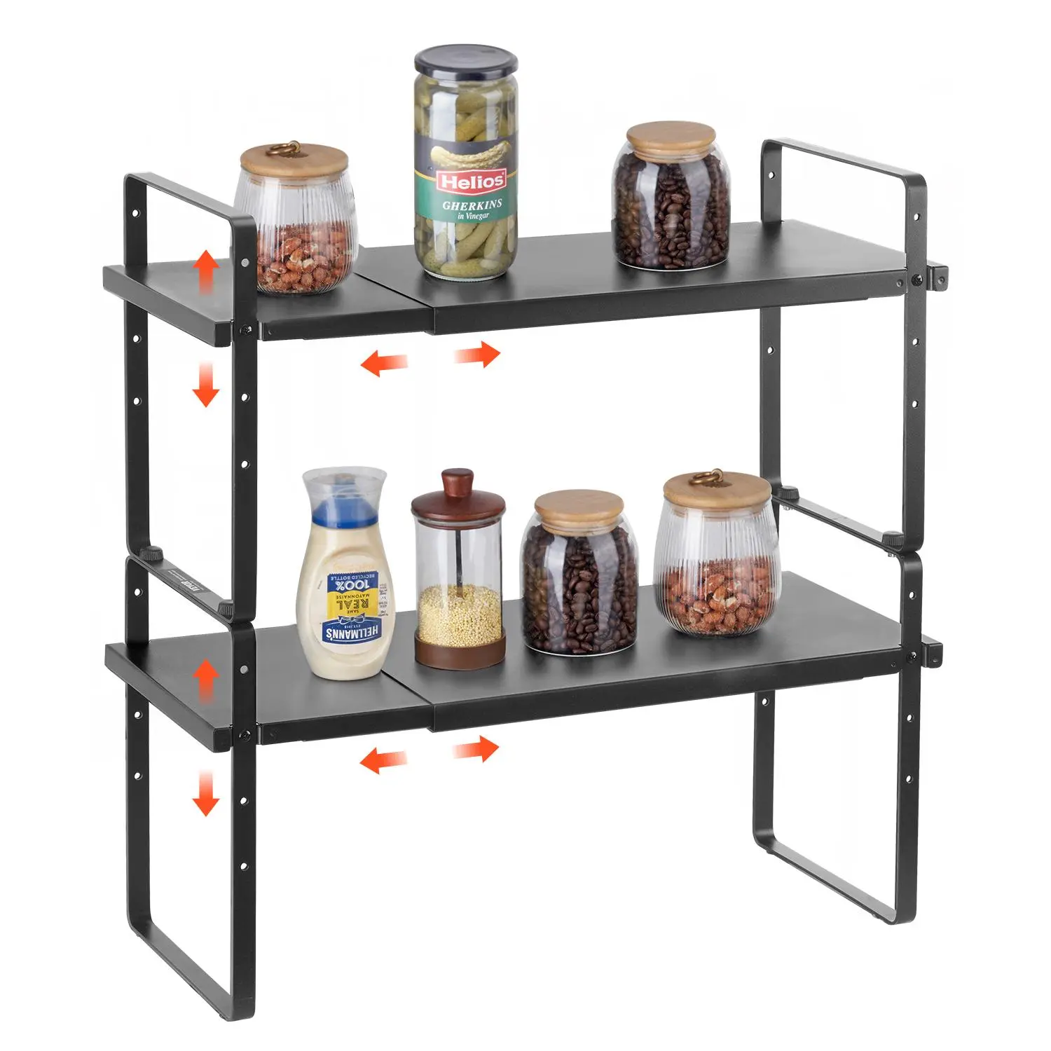 • Expandable Width: This counter shelf features an adjustable width ranging from 16 to 25.6 inches, allowing it to flexibly adapt to different kitchen space sizes and storage needs. By adjusting the width, it fully utilizes available space, significantly increasing storage capacity. Whether it's a narrow corner or a spacious countertop, it perfectly fits any space