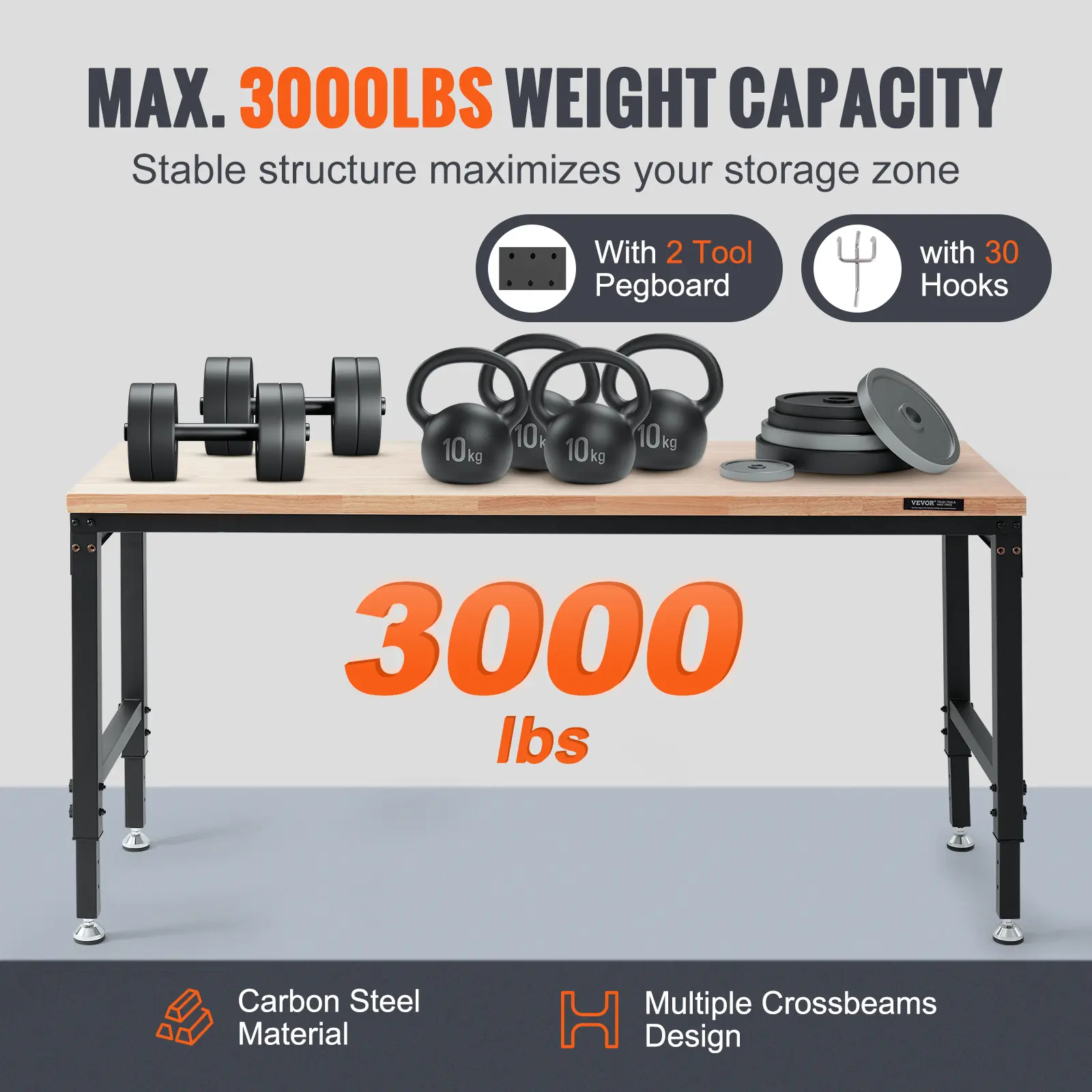• Stable Structure: Workbench for Garage is made of heavy-duty carbon steel, with multiple crossbars designed. The workbench is made of 1.2 inch (ca. 3 cm) thick rubber wood, which is strong and hard to wear. We use the transparent coating for environmental protection. Effectively prevents the table from moldy. Maximum load bearing is up to 3000 lbs.