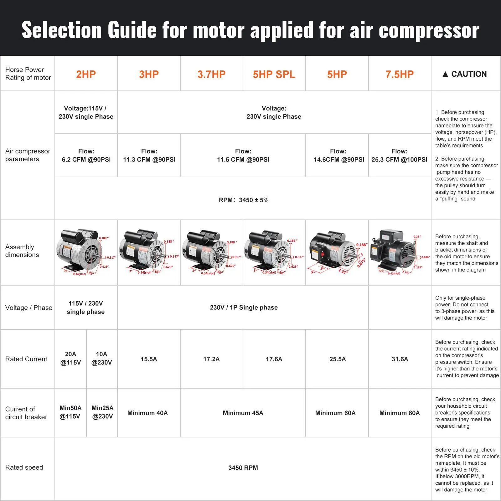 • High Performance: 5HP 3450 RPM, Single Phase, Full Load Amps: 25Amp, 230V 60Hz, SF: 1.0.