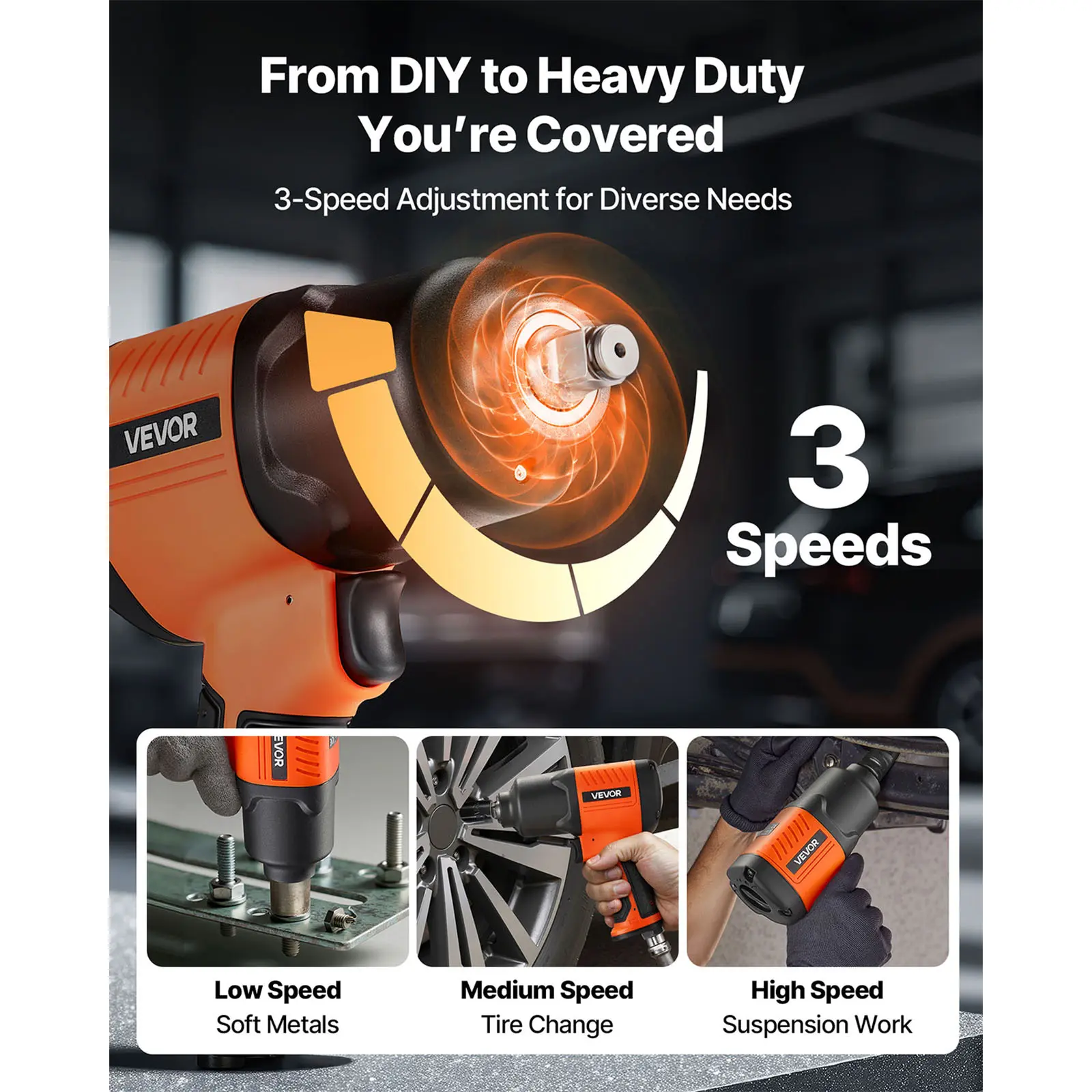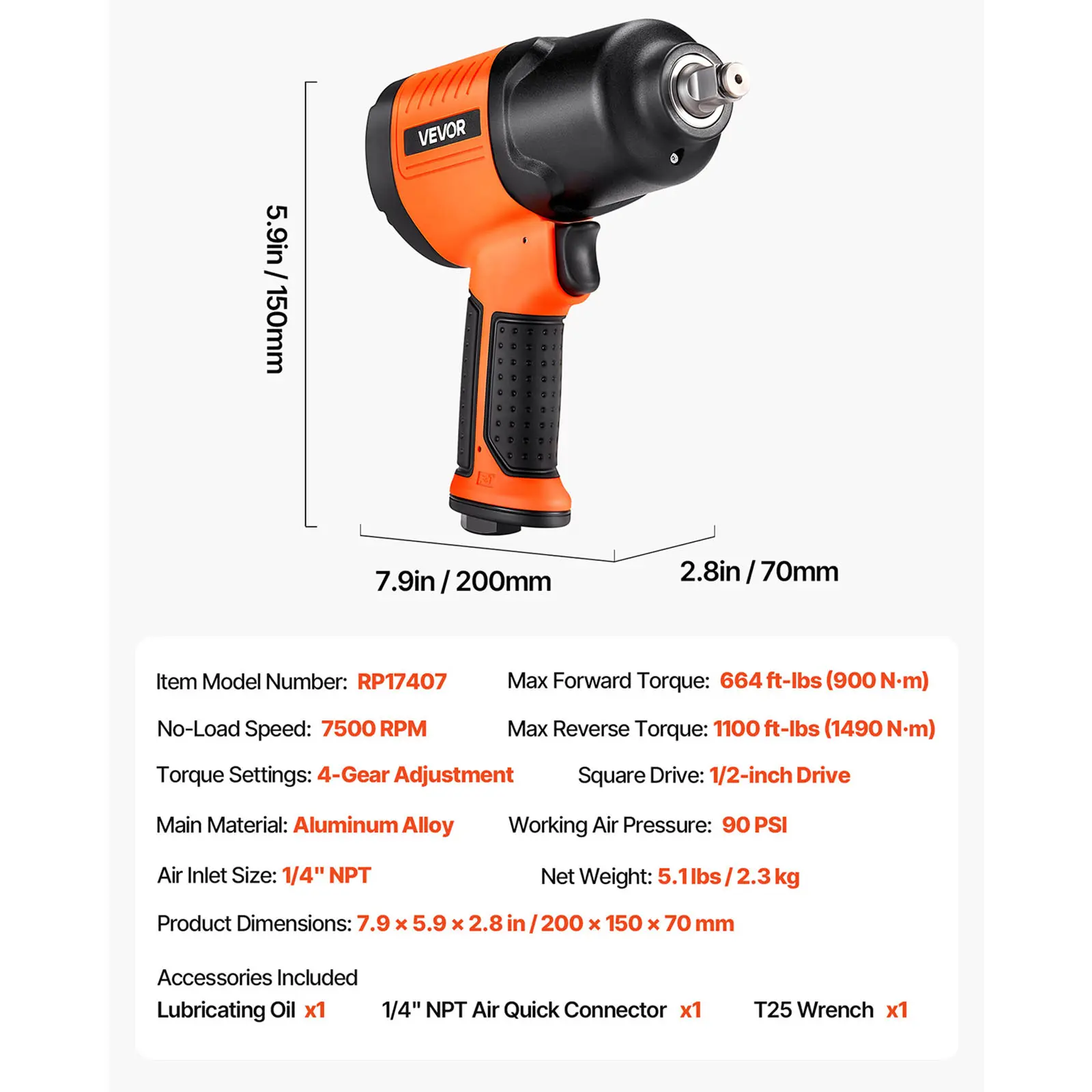 • Wide Applications: VEVOR 1/2 inch air impact gun is powerful enough to loosen bolts and nuts, ideal for light duty auto repair shops or home repairs and maintenance; Air Consumption: 6.3 CFM. Working Pressure: 90PSI, Air Inlet: 1/4" NPT
