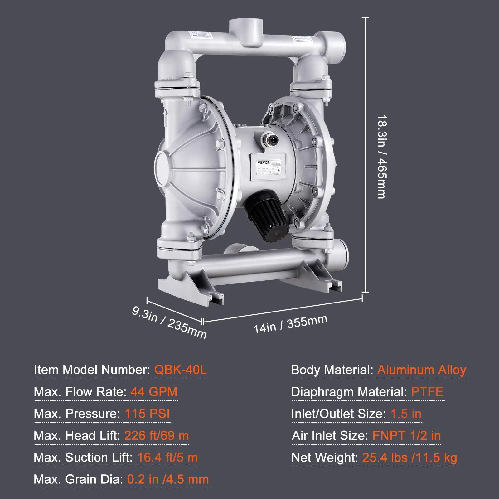 • Premium PTFE Diaphragm: Our air operated diaphragm pump features state-of-the-art dual-layer PTFE diaphragms for exceptional corrosion resistance. These diaphragms excel in the harshest environments, handling corrosive fluids with unparalleled efficiency. Max. Flow Rate: 44 GPM. Max. Pressure: 115 PSI. Max. Head Lift: 226 ft/69 m. Ready to experience the difference? Let's power up your productivity!