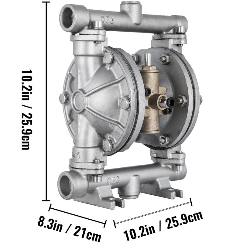 • Premium Double PTFE Diaphragms: Our air-operated double diaphragm pump adopts PTFE diaphragms, durable, corrosion-proof, and long-lasting. Max. Temperature: 150 ℉/66 ℃; Max. Pressure: 90 psi; Max. Flow Rate:3 GPM; Max Head Lift:196.85 ft/60 m±15%.