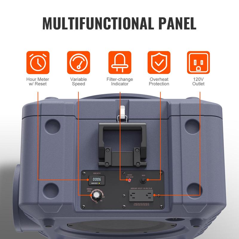• Plug and Work: No assembly is required; simply plug it in and it's ready to use. You'll find two auxiliary sockets on the panel, allowing you to daisy chain up to 3 units with a combined airflow speed of 1650 CFM. This makes it ideal for heavy restoration work in multiple rooms.