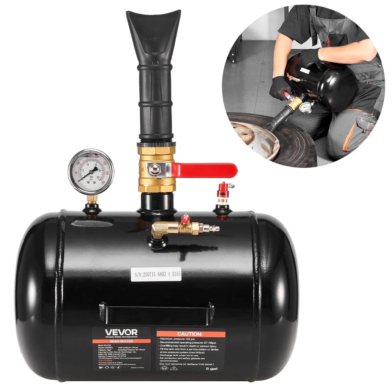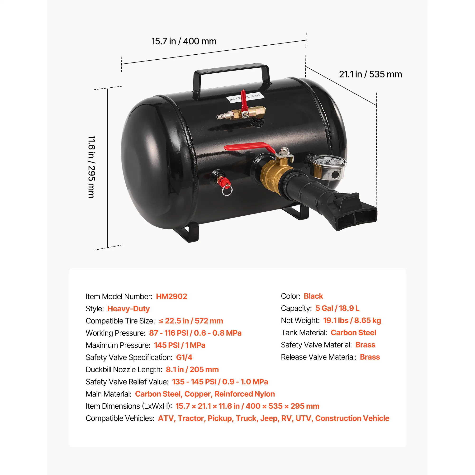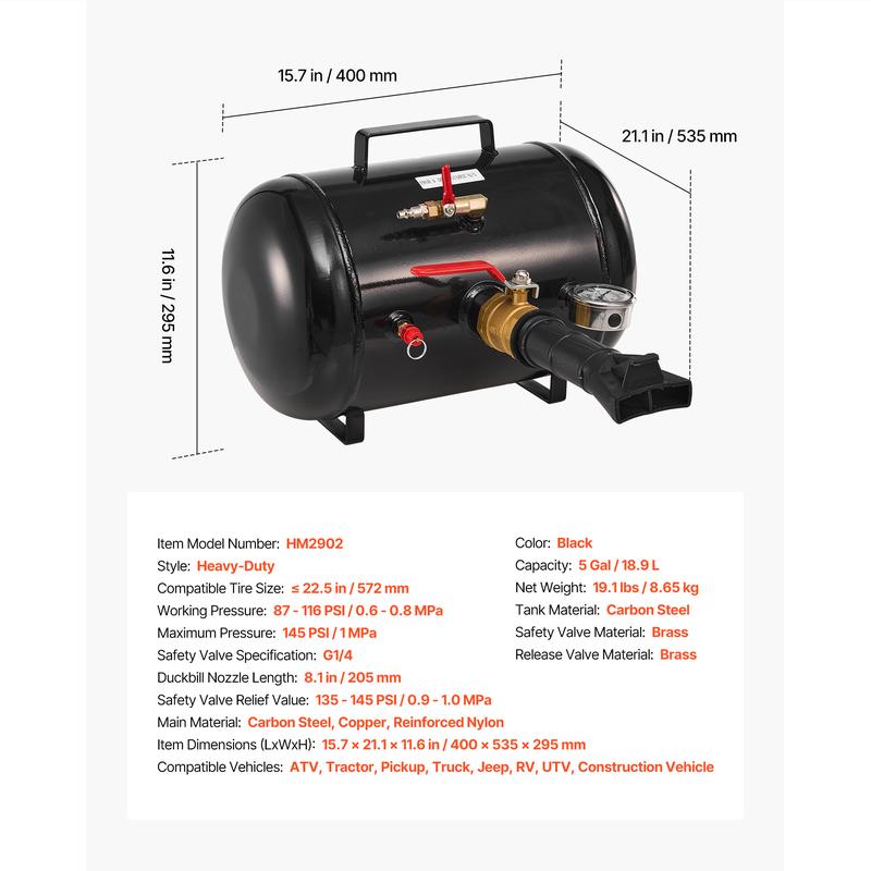 The 5 Gal / 18.9 L cylinder fits tubeless tires ≤ 22.5 in / 572 mm. It operates at 87–116 PSI / 0.6–0.8 MPa. Suitable for ATVs, tractors, pickups, trucks, Jeeps, campers, and construction vehicles. Ideal for home garages, workshops, farms, and service stations.
