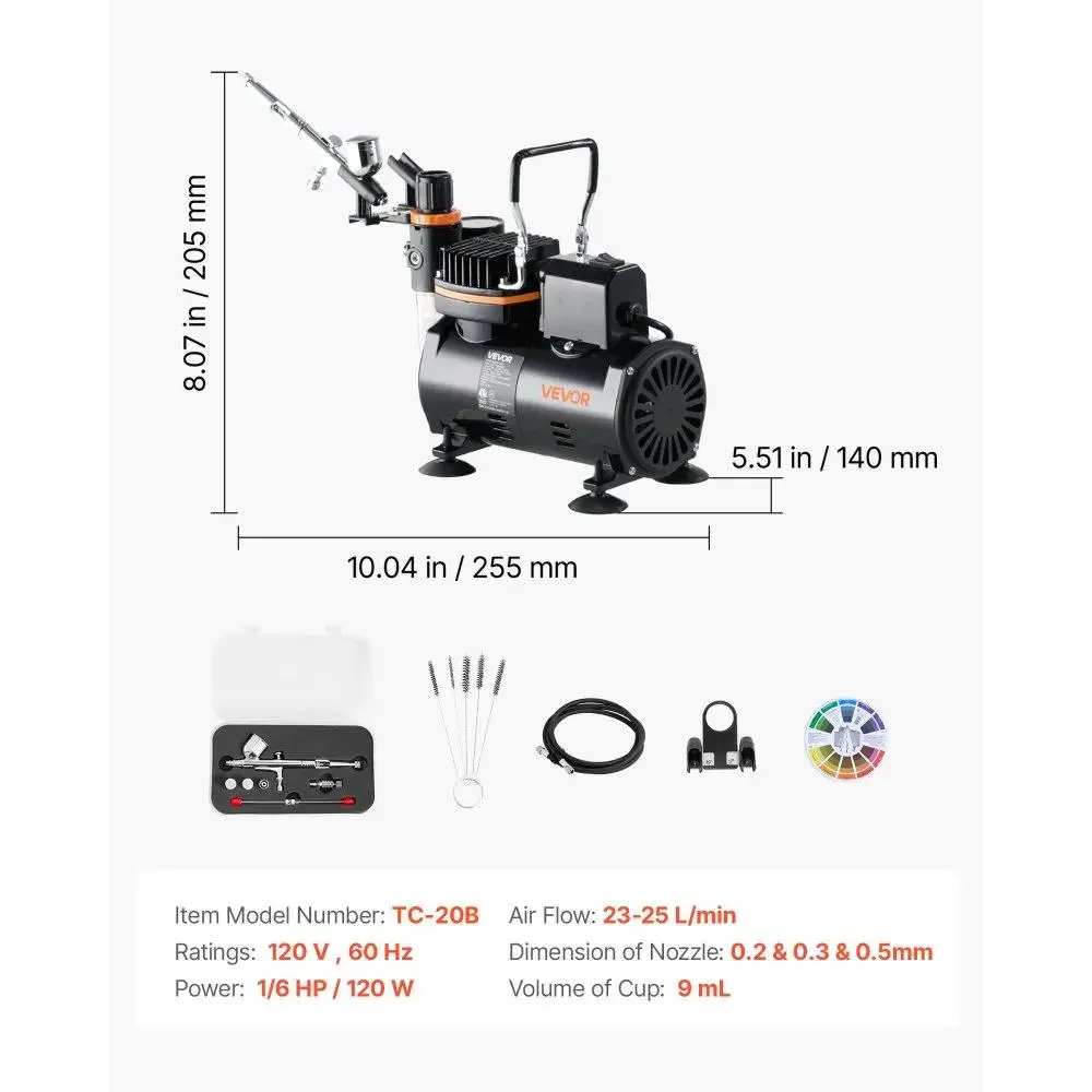 The VEVOR Airbrush Kit, 1/6 HP, includes a dual-action airbrush with 3 tips, hose, holder, and cleaning set. Perfect for cake decorating, model painting, and nail art. This kit offers low noise operation, ensuring a peaceful environment for your creative projects.