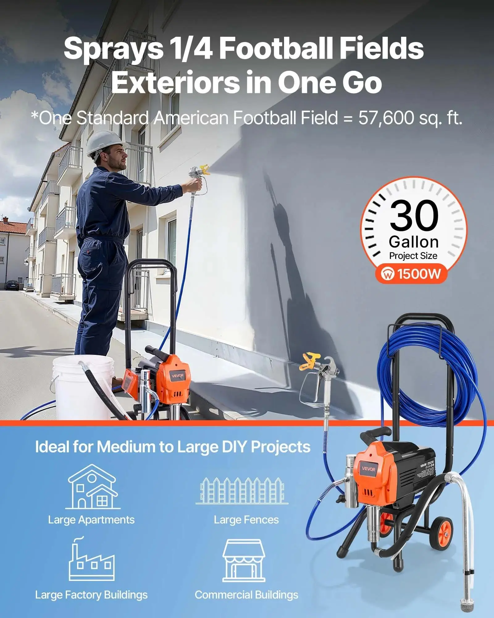 The VEVOR Stand Airless Paint Sprayer boasts a 1500W motor, delivering a 0.7 GPM flow and 3300 PSI pressure. This ensures spraying speeds 8x faster than rollers and 20x faster than brushes. Ideal for large-scale projects like apartment complexes and buildings, this sprayer offers efficient coating solutions.