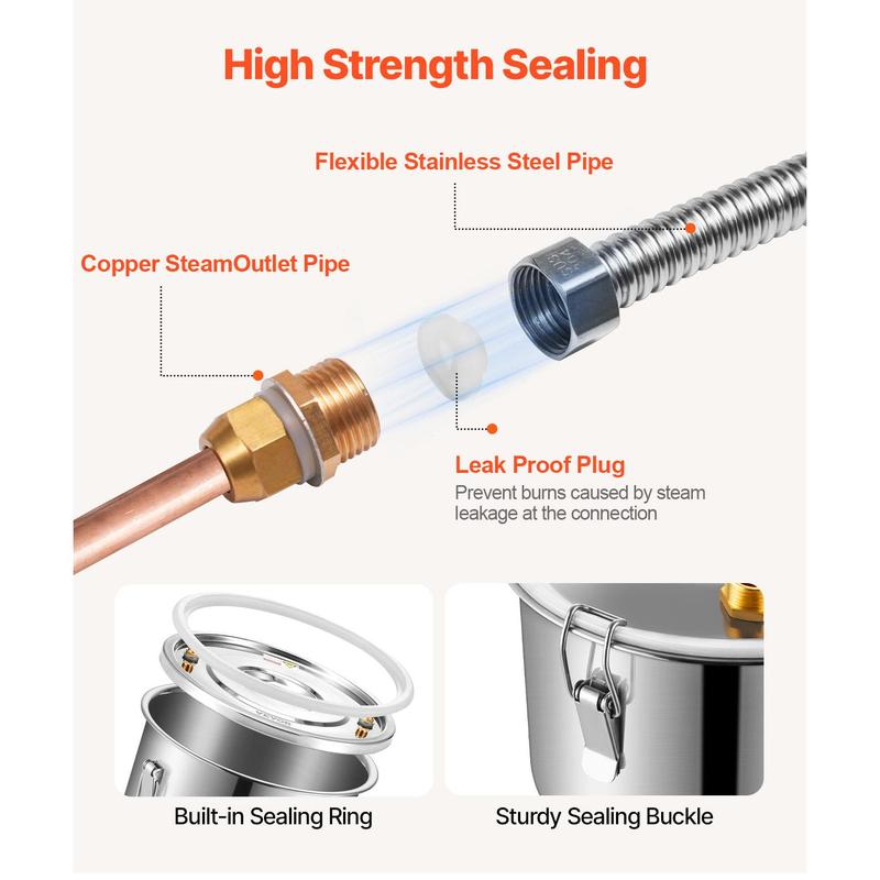 • Secure Fermentation and Heating: The fermentation barrel is convenient to use. A unidirectional exhaust valve releases gases produced during fermentation, reducing internal pressure. The thickened stainless steel bottom is compatible with various heating methods such as wood fire, gas stoves, and gas stoves, preventing deformation and damage. The temperature gauge on the lid displays Celsius and Fahrenheit temperatures, facilitating temperature monitoring during distillation.