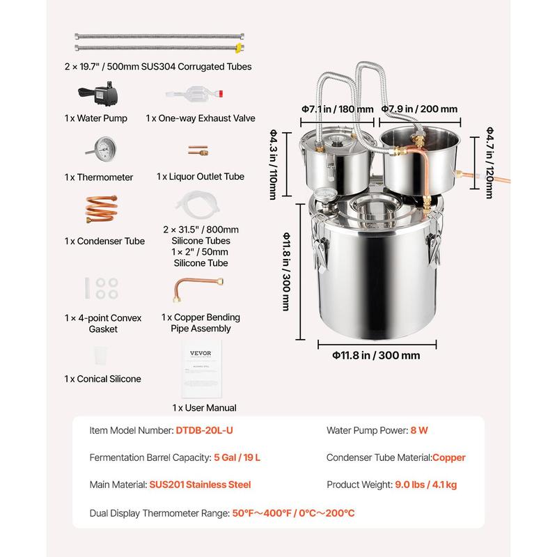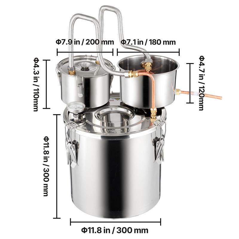 • 5Gal Dual Condenser Distiller Kit: We offer a complete kit for this flavor-enhancing distiller, ideal for brewing fruit wines, whiskies, brandies, champagnes, vodkas, water, ethanol, and other distilled products at home. The main components include a fermentation barrel, barrel lid, cooling pot, and thumper keg. The fermentation barrel comes in multiple sizes: 3Gal, 5Gal, 8Gal, 13.2Gal, catering perfectly to family gatherings or parties with friends.